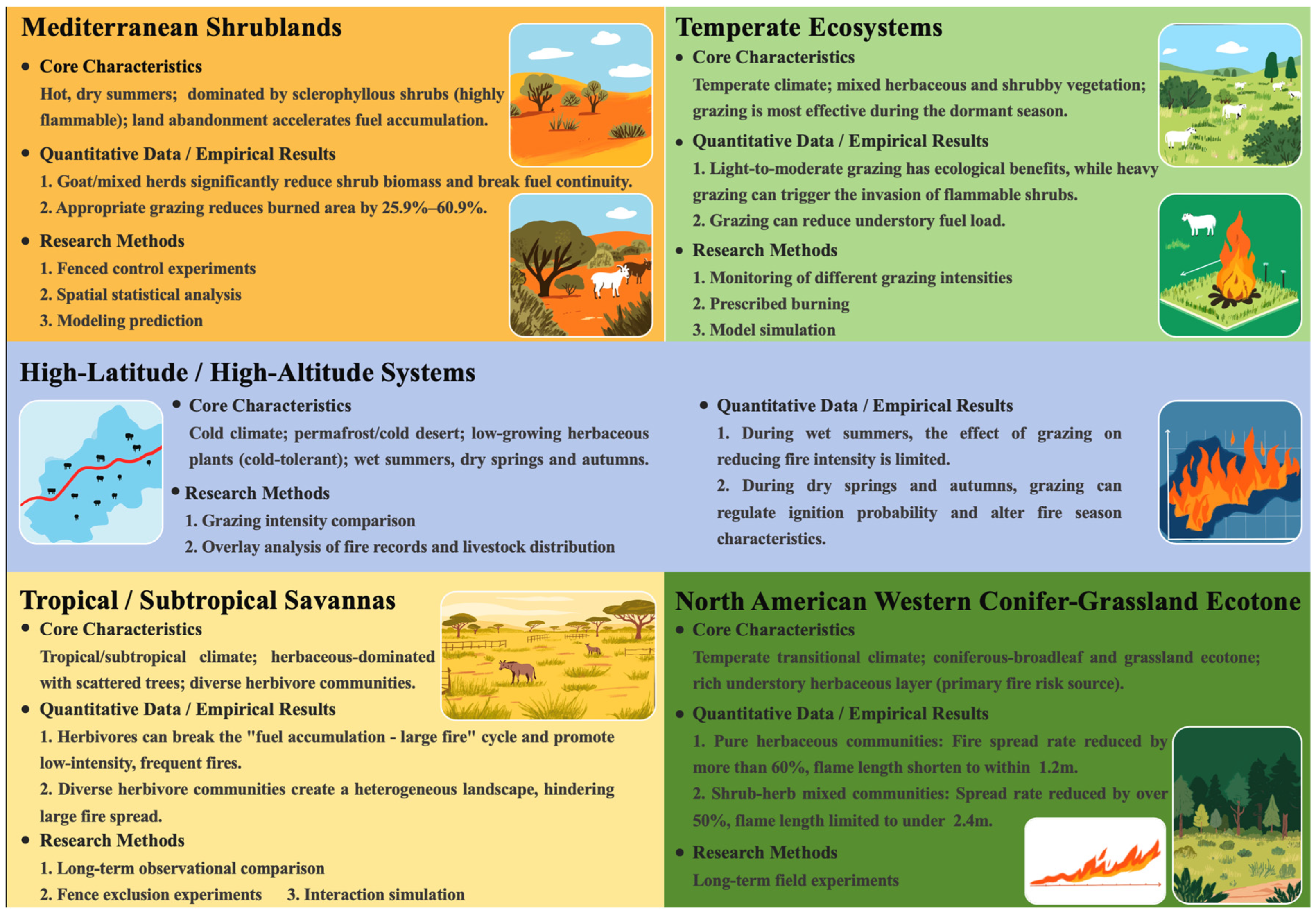 3. Regional Case Studies: Divergent Grazing Outcomes in Global Fire-Prone Ecosystems