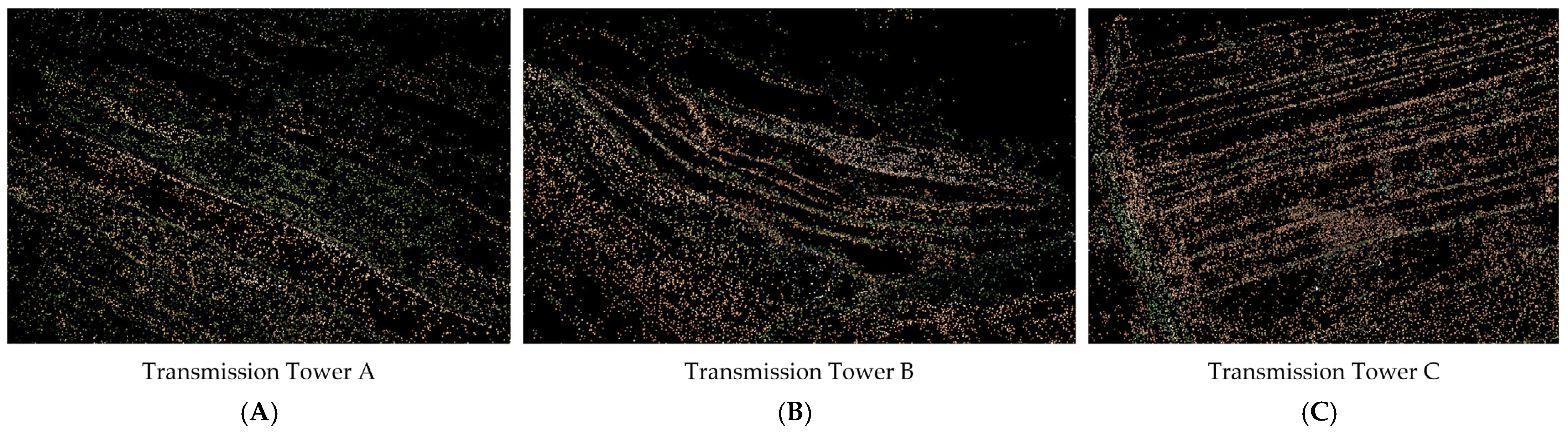 Figure 5 presents the results of sparse point clouds generated for the three power towers.