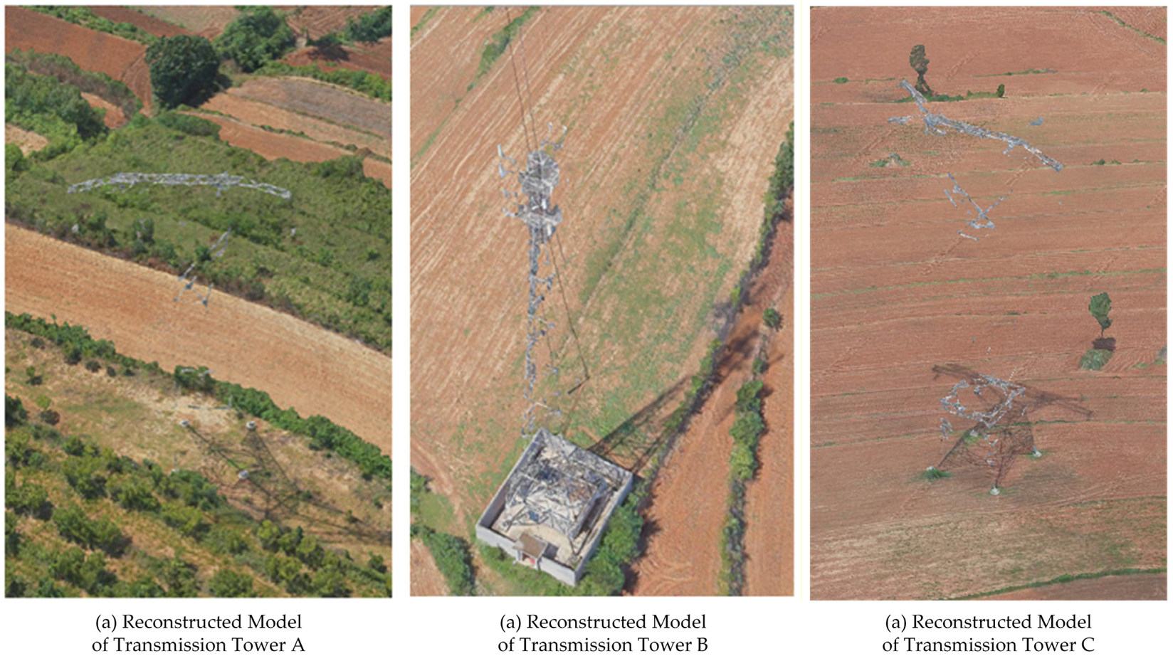 Figure 4. Tower A is a symmetrical metal tower frame of the double-circuit tower type, with a circular base at the bottom and high geometric regularity. Its symmetrical structure provides stable “repeating patterns” for cross-view feature matching in SfM, facilitating the extraction of high-confidence feature points (e.g., tower frame nodes, antenna brackets) and reducing the false matching rate. The foreground consists of reddish-brown farmland, while the background comprises vast green vegetation, creating high-contrast color tones of “red-green-silver-gray.” The ridge and furrow textures of the farmland and vein details of the vegetation supply dense local features, enhancing the geometric constraints of the SfM sparse point cloud. Additionally, the continuous texture of the green vegetation assists in the depth estimation of camera poses, further improving the accuracy of the point cloud.