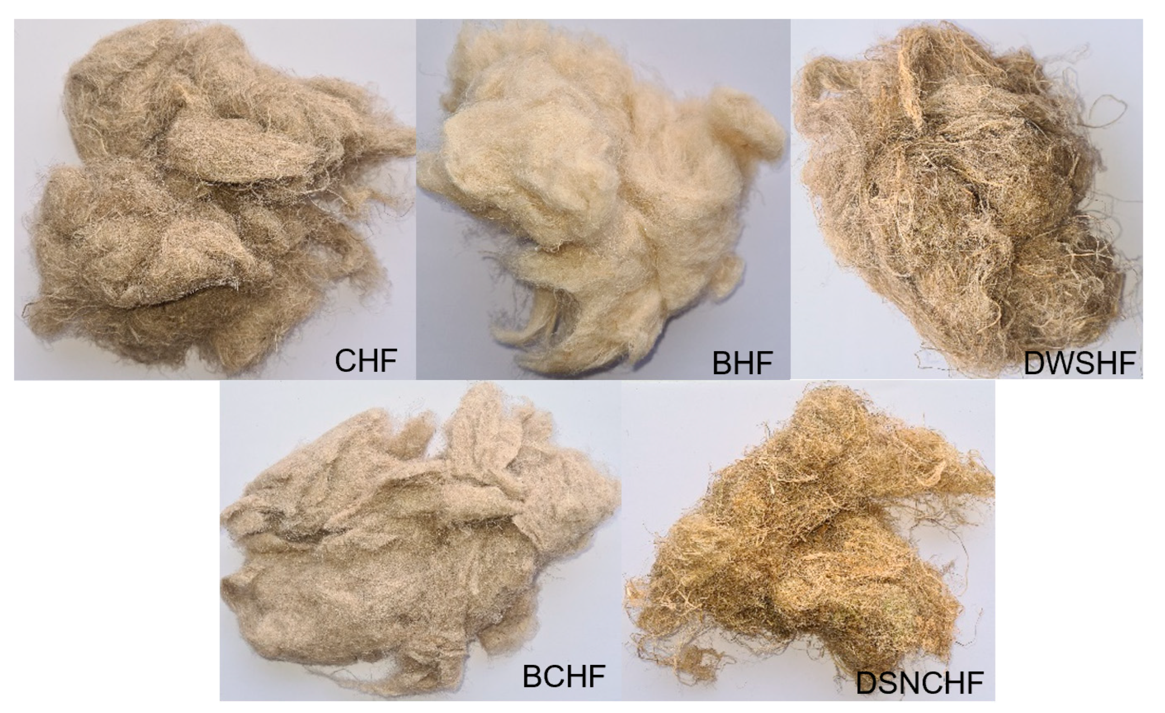 This section presents experimental and theoretical research methodologies. Five different types of hemp fibre samples were tested: bleached (BHF), cottonized (CHF), boiled cottonized (BCHF), well-stripped decorticated (DWSHF), and short, not combed decorticated fibres (DSNCHF). The tested hemp fibres are presented in