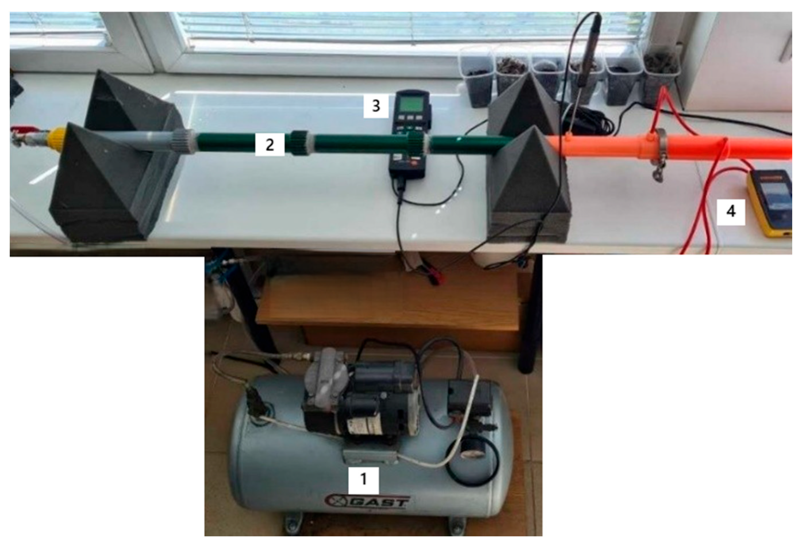 Pressure is generated in the system using a compressor. The air in the stand moves through a long tube, which allows for an almost laminar airflow. The airflow velocity is determined using a Testo 452 airflow velocity metre (Testo SE & Co, Titisee-Neustadt, Germany). To measure the pressure difference, a Retrotec DM32 (Retrotec Inc., Everson, WA, USA) differential pressure gauge is used, the accuracy of which reaches 0.1 Pa. In order not to affect the accuracy of determining the resulting pressure difference, the airflow velocity generated in the stand reaches 0.01 m/s. When determining the airflow resistivity of the tested fibres, the airflow velocity (