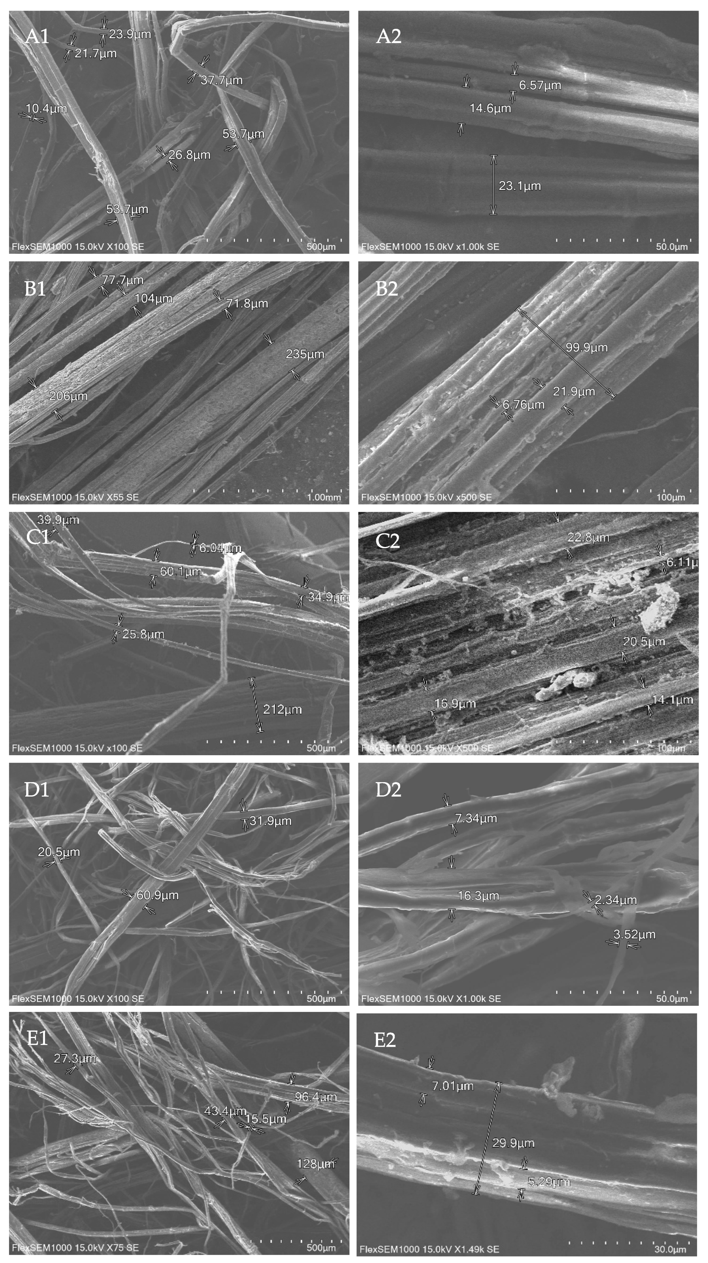 Microstructural analysis of various hemp fibres was performed using a Scanning Electron Microscope (SEM) to determine their morphological properties. A Scanning Electron Microscope, “FlexSEM1000 (Hitachi High-Tech Corporation, Minato-ku, Tokyo, Japan)” with an accelerating voltage of 15.0 kV, was used for the experiments. The magnification ranged from ×55 to ×1490.