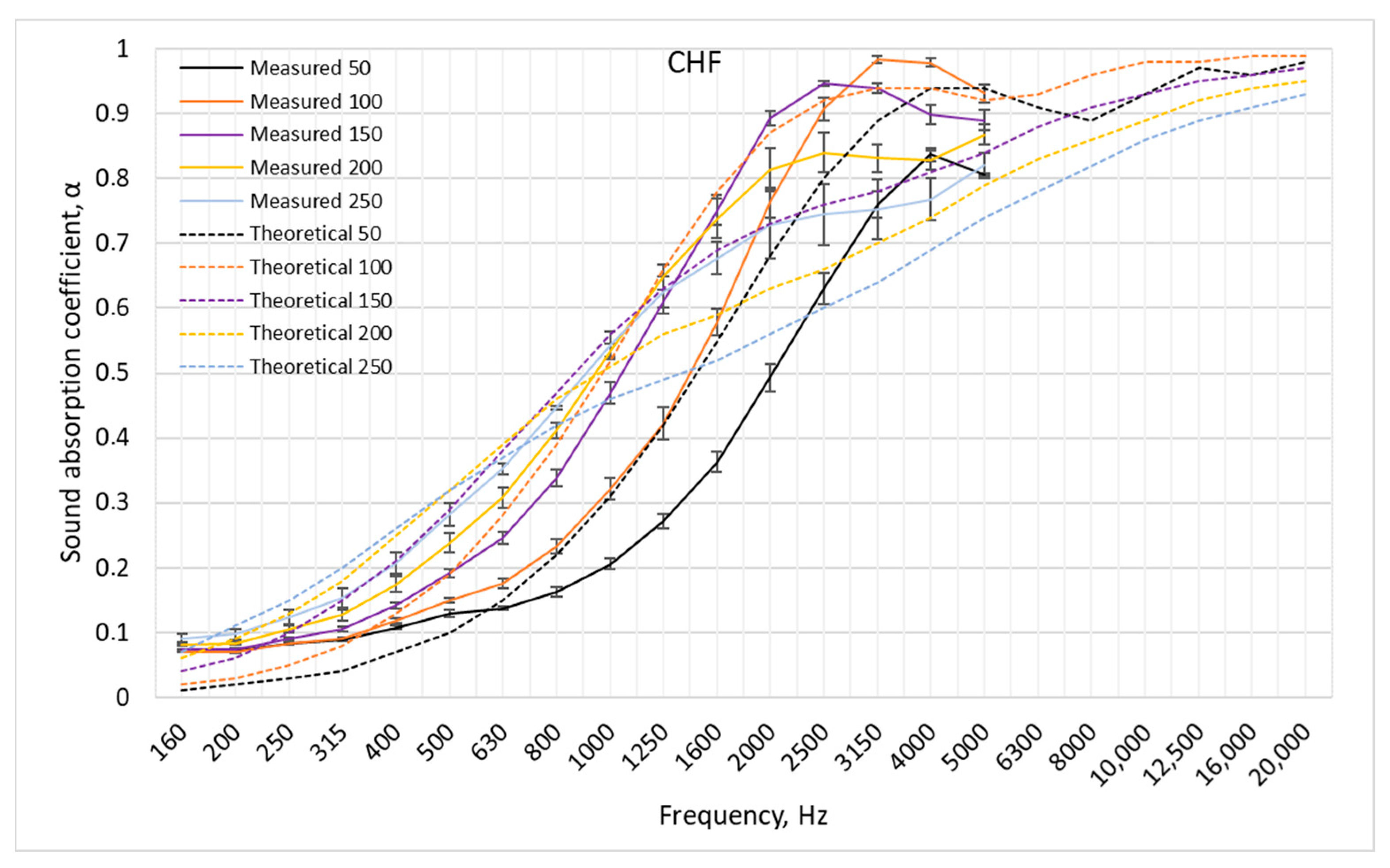3, is better than predicted in the theoretical study. The average discrepancy between the results of the CHF theoretical study and the experimentally determined results, in the entire frequency band (160–5000 Hz), ranges from 17.2% (when studying the sound absorption of a 250 kg/m