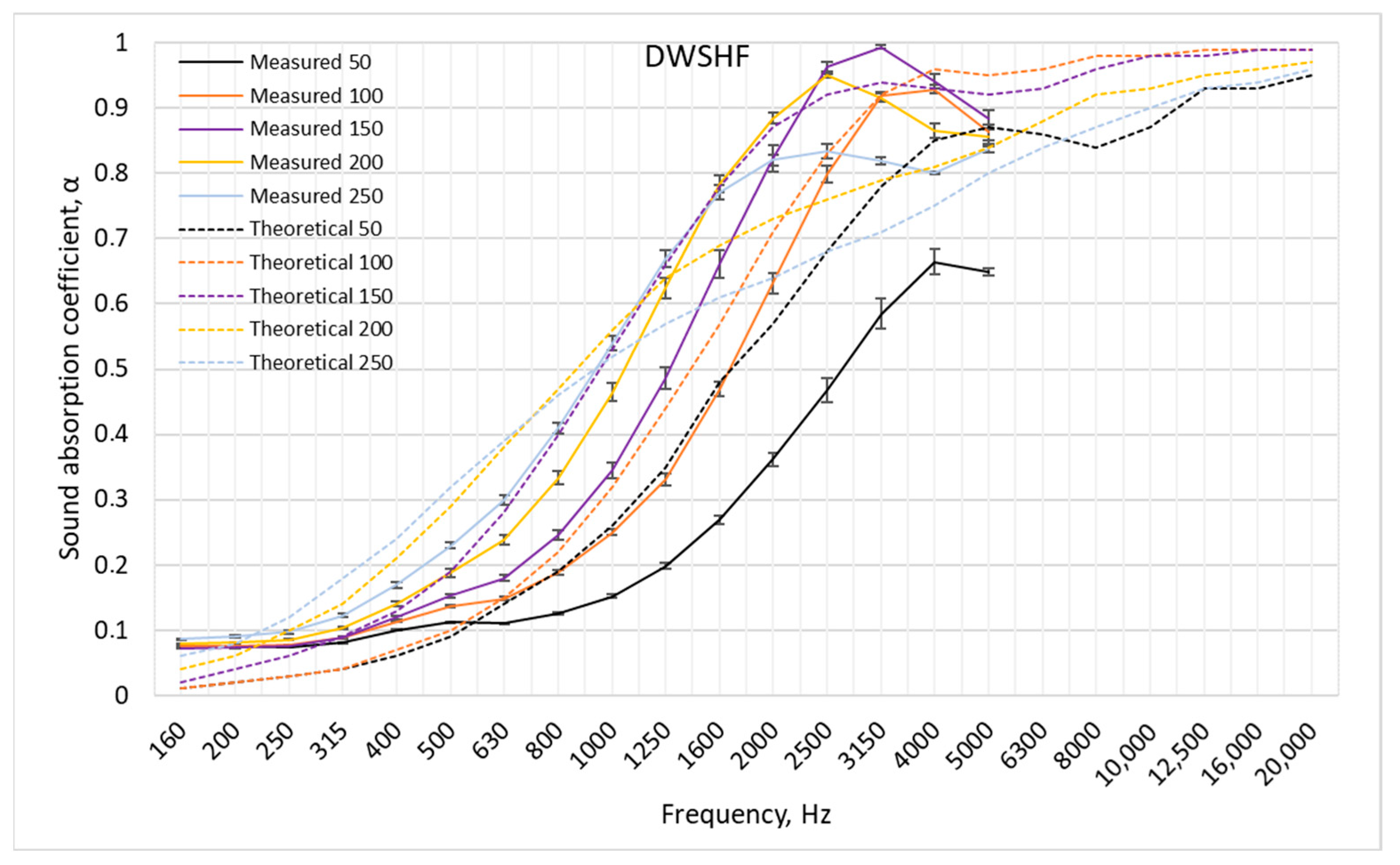 3, the predicted sound absorption results are higher than those determined by measurements, but the peaks are observed at the same frequencies. The average discrepancy between the theoretical study results and the DWSHF in the entire frequency band (160–5000 Hz) ranged from 21.1 to 52.1%.
