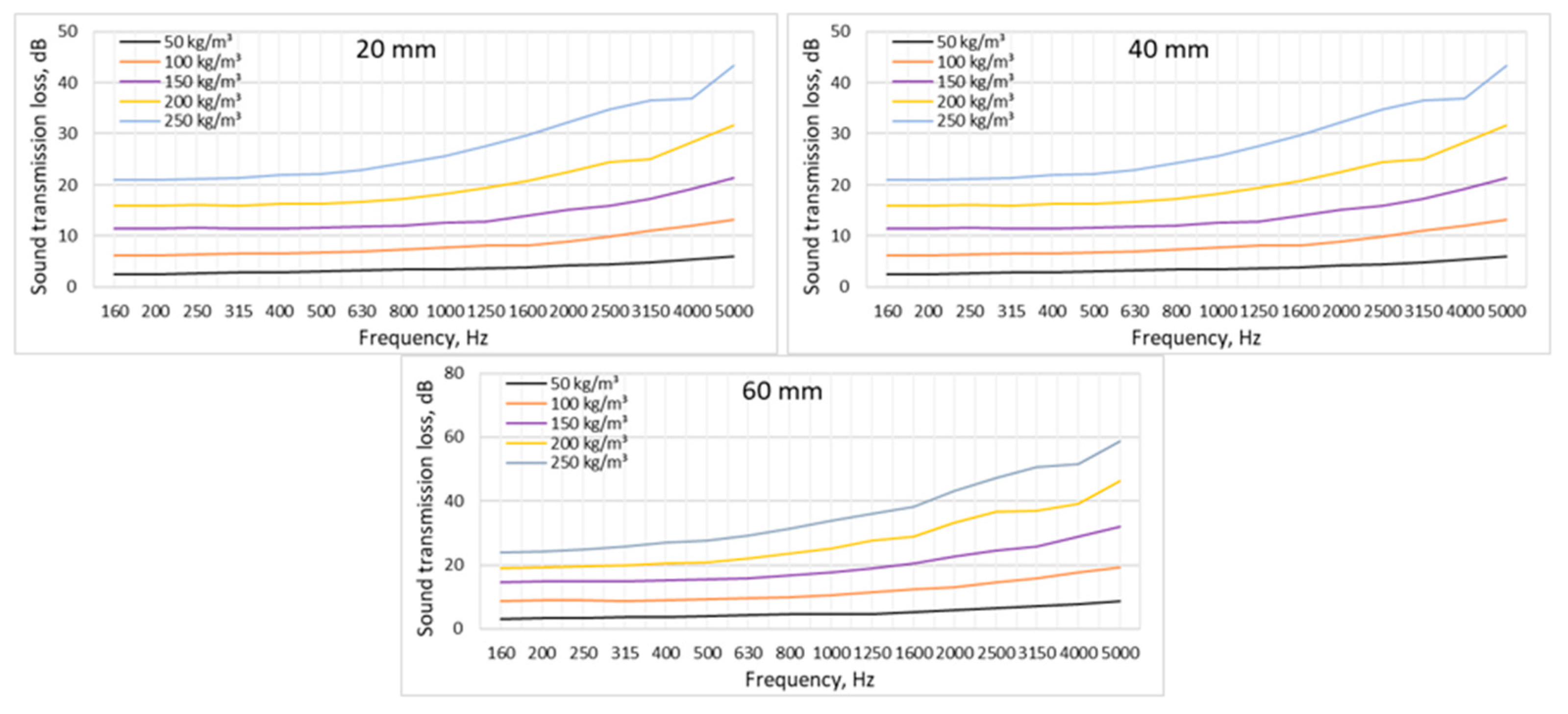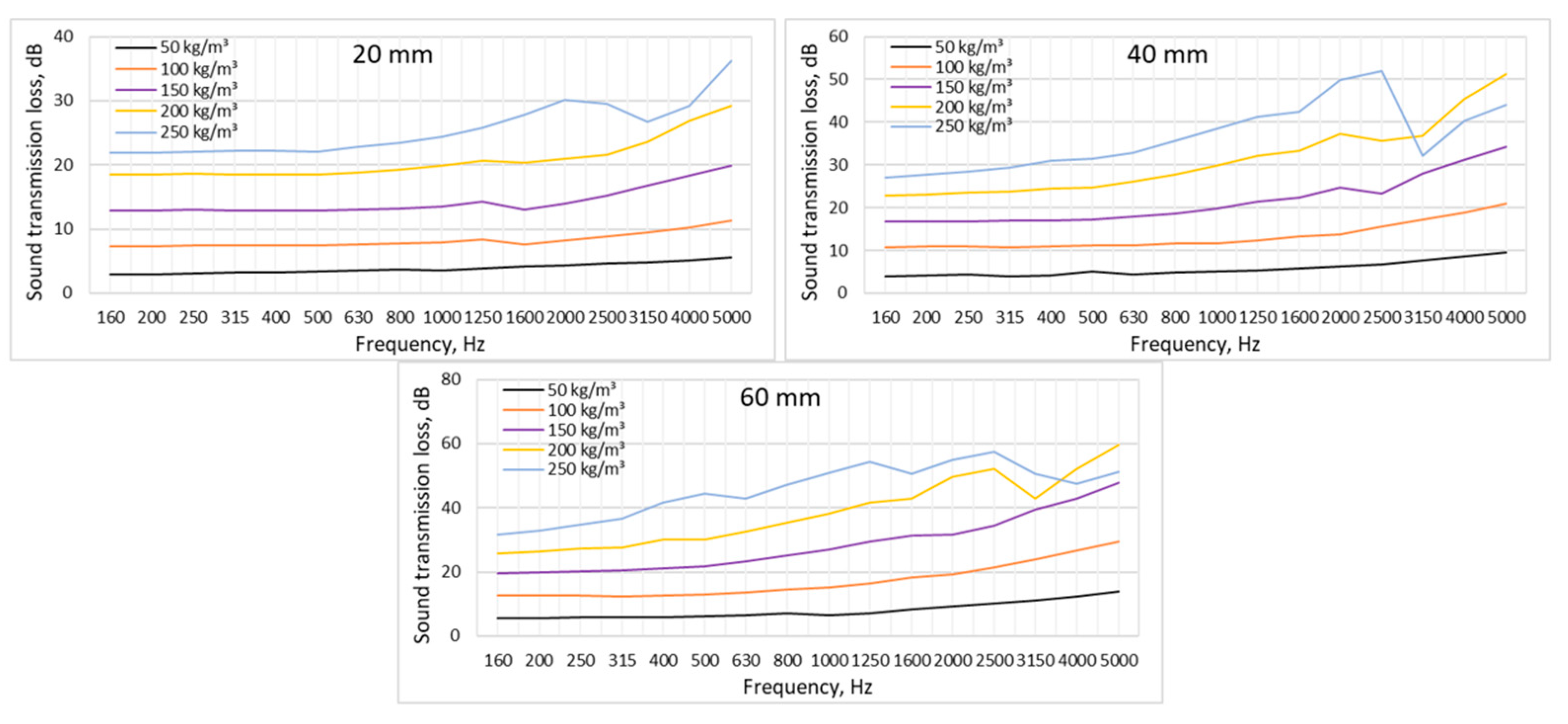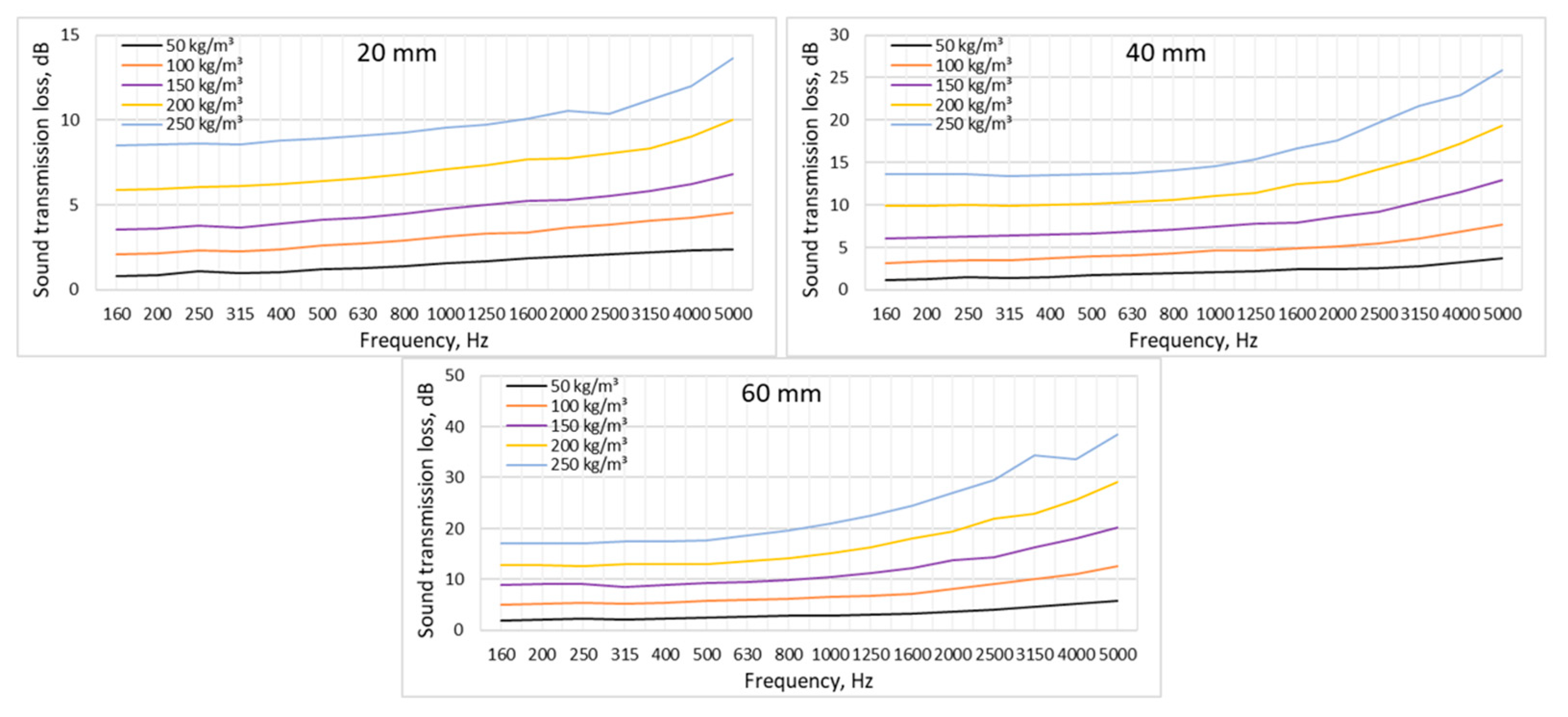 The sound transmission loss (DTL) of BHF 40 mm in the entire frequency band varies from 21.04 dB to 43.40 dB for a fibre with a density of 250 kg/m3, and the sound transmission loss of BHF 60 mm in the entire frequency band varies from 23.78 dB to 58.63 dB for the same fibre density.