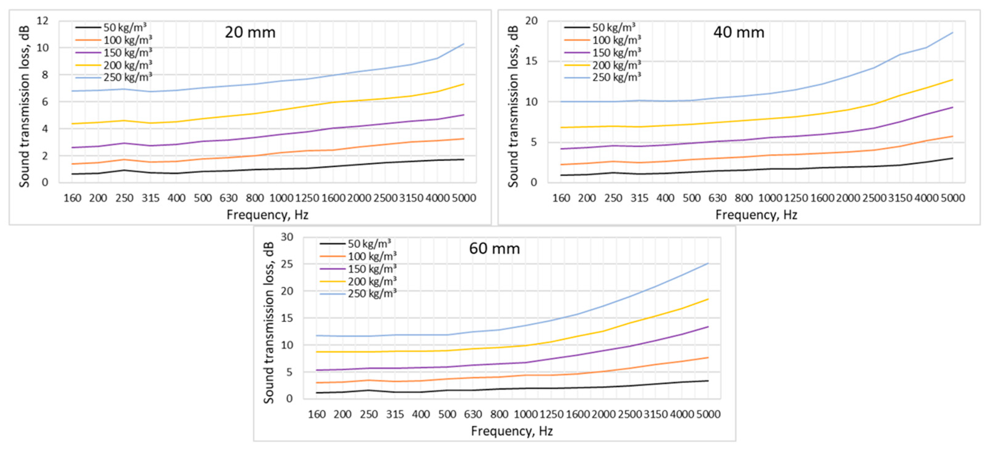 Figure 15) show that the trend remains the same as in the previously described results, and the highest sound transmission loss values are determined in the 250 kg/m
