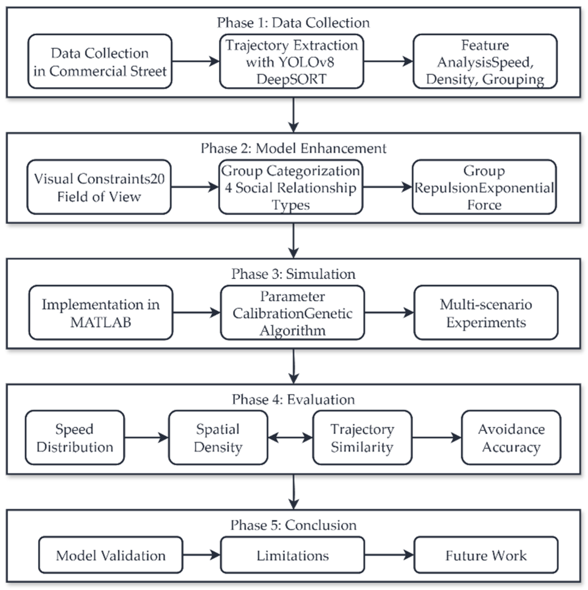 - A Data-Driven Analysis Framework: A comprehensive Python 3.9-based workflow integrating YOLOv8 and DeepSORT was developed to extract high-fidelity pedestrian trajectories. This pipeline enables comprehensive analysis of velocity distributions, spatial density maps, avoidance events, and group dynamics, thereby providing a robust empirical foundation for model calibration and validation.