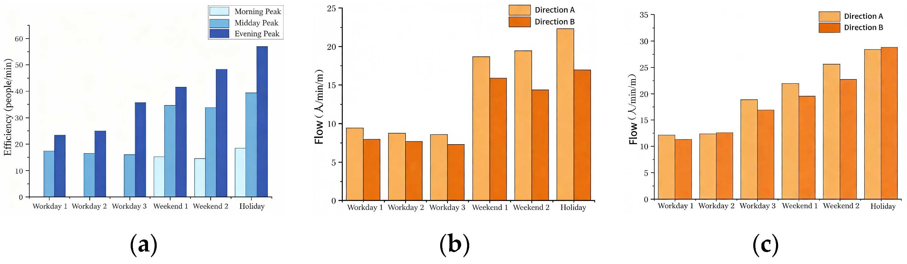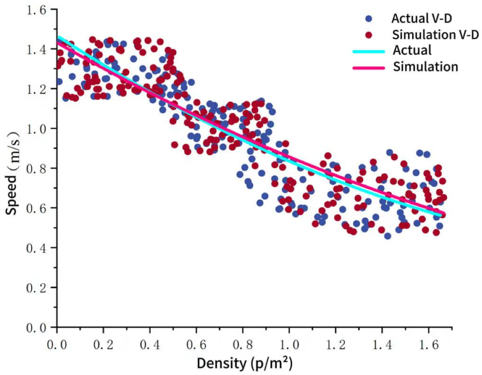 - Model Validation and Performance Evaluation: A comparative analysis between simulation outputs and field data from commercial streets demonstrates that the enhanced model achieves close alignment with empirical observations across multiple dimensions: speed distribution (mean deviation < 0.05 m/s), density spatial patterns, avoidance event frequency (121 simulated vs. 116 observed), and collective movement characteristics. These results confirm the reliability and practical applicability of the proposed model for simulating pedestrian dynamics in similar high-density commercial environments.