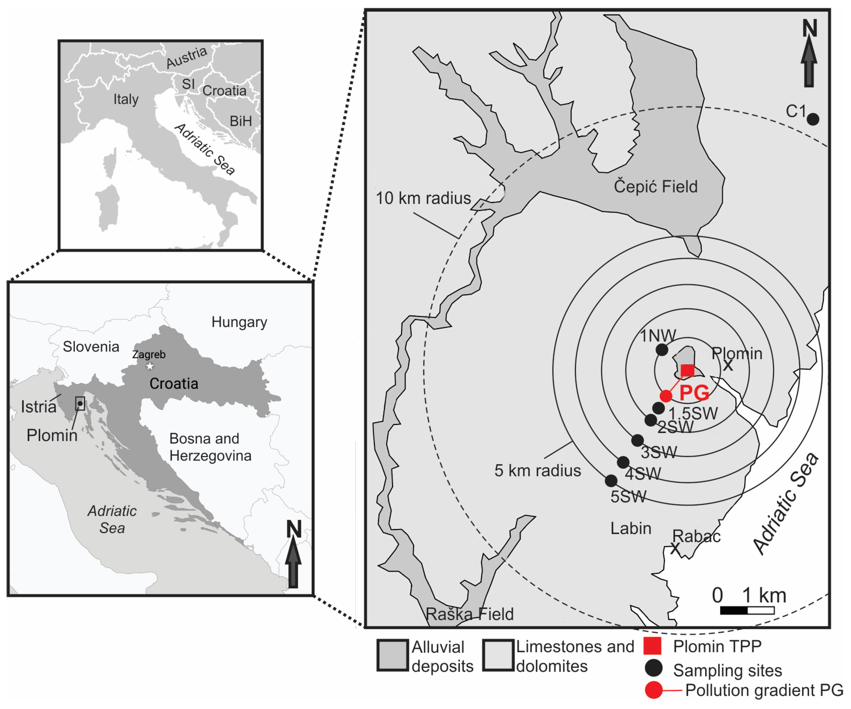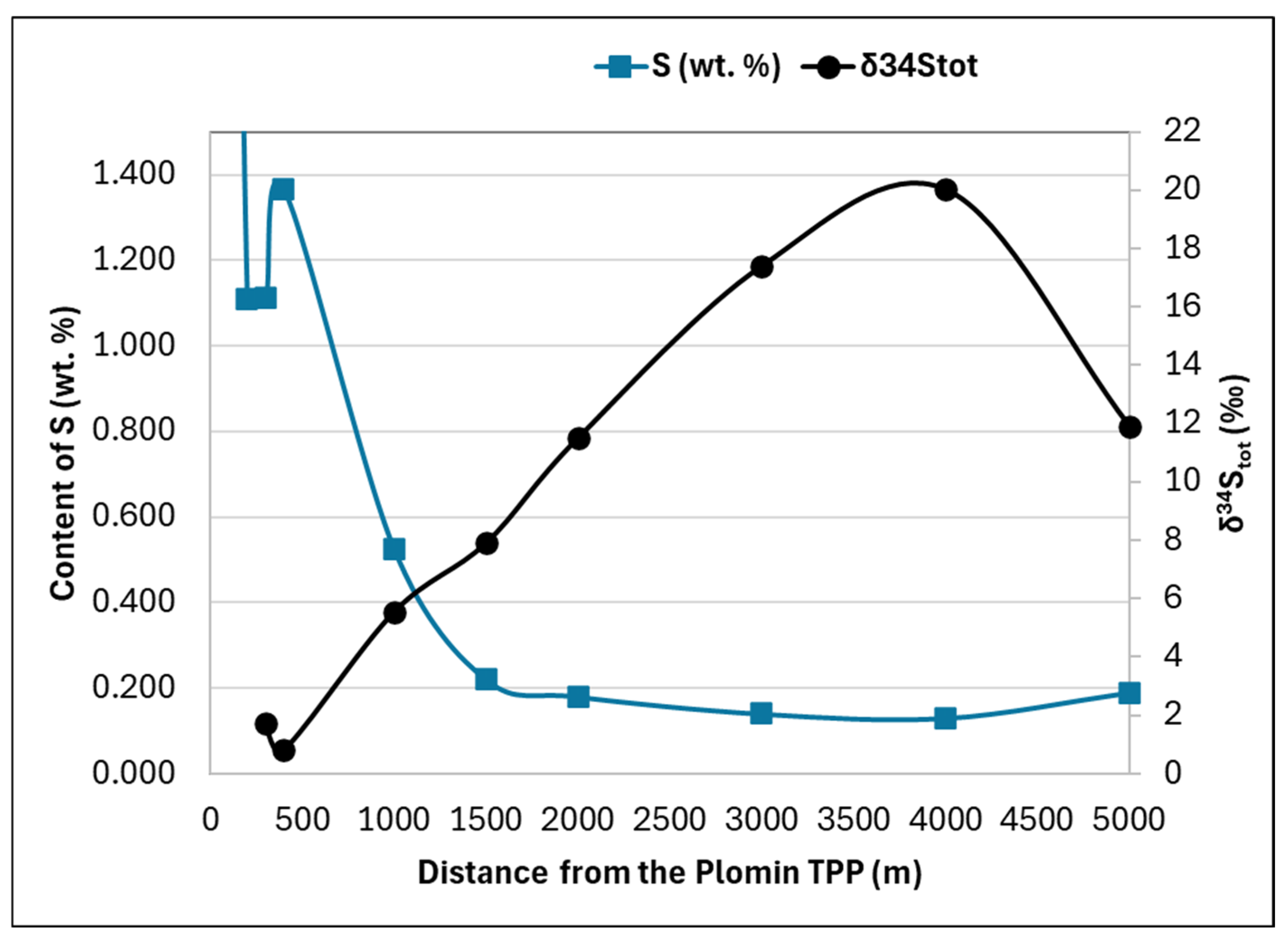 - The S isotopic composition (δ34S) varies with distance from the Plomin TPP, confirming that 34S-depleted emissions from Raša coal combustion were the primary source of anthropogenic contamination. Increasing δ34S values with distance suggest an increasing influence of marine sulfate and natural soil processes.