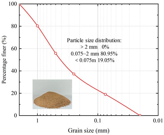 Remolded soil samples were obtained via trenching from the shore slope of a pumped storage power station in Fujian. To investigate the effects of matric suction and drying-wetting cycles on the shear strength of the granite residual soil under controlled conditions, it was essential to minimize variability caused by natural soil heterogeneity. Although remolding disturbs the natural fabric and crack structure, it ensures uniform initial conditions for all samples. The basic physical properties of the soil samples were tested in the laboratory according to the standard for geotechnical testing method of China (GB/T 50123-2019) [20], and the results are presented in Figure 2 and Table 1.