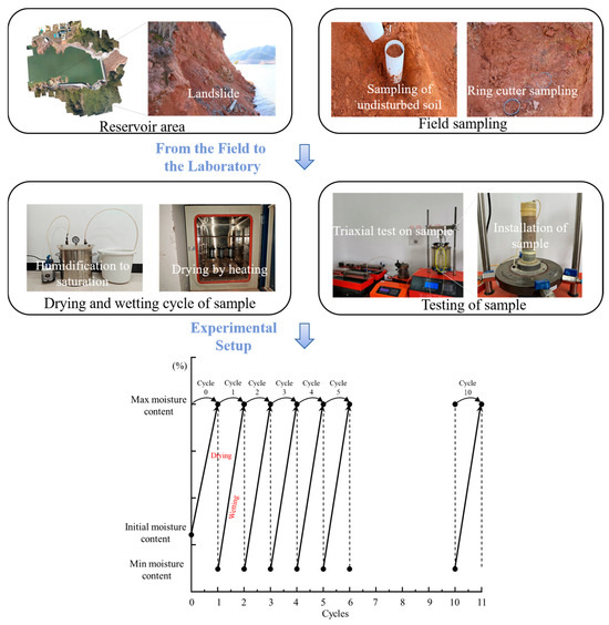 The experimental process is shown in Figure 3. It mainly includes field sampling, drying and wetting cycle, and triaxial test. According to relevant studies, the first drying and wetting cycle has the most significant impact on the sample, and after 5 to 7 cycles, the soil-water characteristics and mechanical properties of the sample tend to stabilize [21,22]. Therefore, 10 cycles were conducted to examine the effects of varying drying and wetting cycles on the sample’s properties in this experiment. The experimental procedure involves the following steps: First, the target moisture content was aimed at achieving full saturation in the wetting phase. According to the testing procedure outlined in the standard for soil testing methods (GB/T 50123-2019), the vacuum saturation method was used to saturate the samples. The degree of saturation was determined by comparing the sample weight before and after saturation, with a saturation greater than 95% considered fully saturated. Then, the sample is subjected to 8 h of drying at 20 °C and relative humidity 50% ± 5% to reduce moisture content and simulate soil exposure during a falling water level. The process of drying and wetting cycles is shown in Figure 3. This experimental approach simulates the impact of water level fluctuations on soil samples, providing a solid basis for studying the soil-water characteristics and mechanical properties of soils under drying and wetting cycles.