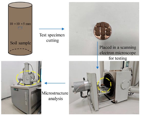 Moreover, a scanning electron microscope (Quanta 250, Thermo Fisher Scientific, Oakwood, OH, USA) was used to observe the microstructure of soil samples after drying and wetting cycles in this study, as shown in Figure 4. According to the instrument’s sample requirements, the original and cycled soil samples were first cut in half, and representative small specimens (with dimensions controlled at 10 mm × 10 mm × 5 mm) were taken. Next, the processed samples were fixed on the sample holder and introduced into the sample chamber. Finally, observations were conducted in high vacuum mode at an accelerating voltage of 25 kV. Scanning Electron Microscope (SEM) images of the soil samples were collected at different cycles, which reveal the degradation mechanisms of soil strength at the microscopic scale.