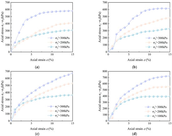 Stress–strain curves under different matric suctions: (a) Matric suction: 50 kPa; (b) Matric suction: 100 kPa; (c) Matric suction: 150 kPa; (d) Matric suction: 200 kPa.