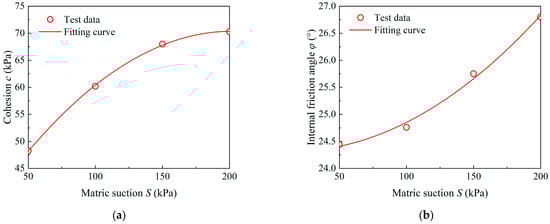 The fitting results reveal that both cohesion and internal friction angle of granite residual soil show a quadratic polynomial relationship with matric suction. This suggests that as matric suction increases, the shear strength parameters—cohesion and internal friction angle—initially increase rapidly and then gradually approach saturation. Specifically, at lower matric suction (<100 kPa), both cohesion and internal friction angle increase significantly with increasing matric suction, showing a pronounced strengthening effect. However, as matric suction further increases, the changes in cohesion and internal friction angle become less pronounced, eventually reaching saturation.