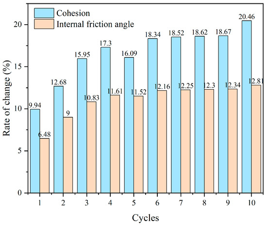 The variation of shear strength parameters with the number of cycles is shown in Figure 10. After the first wetting-drying cycle, the cohesion decreases by 9.9%, while the internal friction angle decreases by 6.5%, accounting for 48.5% and 39.1% of the total reduction, respectively. This stage shows the largest rate of decrease, indicating that drying and wetting cycles cause significant disruption to the internal microstructure of the sample. As the number of cycles increases to 5, the cumulative reductions in cohesion and internal friction angle are 15.4% and 11.1%, respectively. After 10 cycles, the cumulative reductions in cohesion and internal friction angle reach 19.1% and 12.3%, respectively.