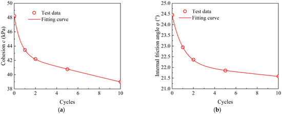 Relationship between shear strength parameters and cycles: (a) cohesion and cycles; (b) internal friction angle and cycles.