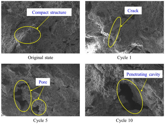 To investigate the effect of drying and wetting cycles on the microstructure, samples were collected from the central section of both the original state and those subjected to 1, 5, and 10 cycles. SEM was conducted at a magnification of 300×, and the results are presented in Figure 12. The evolution of pore structure with increasing cycle numbers can be clearly observed.