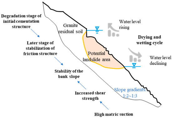 Granitic residual soils are widely distributed in Fujian, China, covering approximately 30% to 40% of the province’s total land area. These soils primarily consist of debris generated by the physical and chemical weathering of granite [1]. The unique mountainous terrain and abundant water resources in Fujian provide favorable conditions for the development of pumped storage power stations [2,3]. Currently, more than ten storage power stations are being operated. These stations regulate grid stability by performing peak shaving and valley filling. However, as the stations continue to operate, the soils along the reservoir shorelines are subjected to periodic water level fluctuations, undergoing prolonged drying and wetting cycles. This process alters the bonding and arrangement of soil particles, affecting the pore structure of the soil [4]. Over time, the continuous wetting and drying cycles gradually degrade the water retention capacity and strength characteristics of the unsaturated shoreline soils, as shown in Figure 1. This deterioration may not only reduce soil stability but also potentially trigger slope instability, leading to landslides and other geological hazards, which can impact the safe operation of pumped storage stations. Addressing this issue has become a critical engineering challenge affecting the safe and stable operation of these stations.
