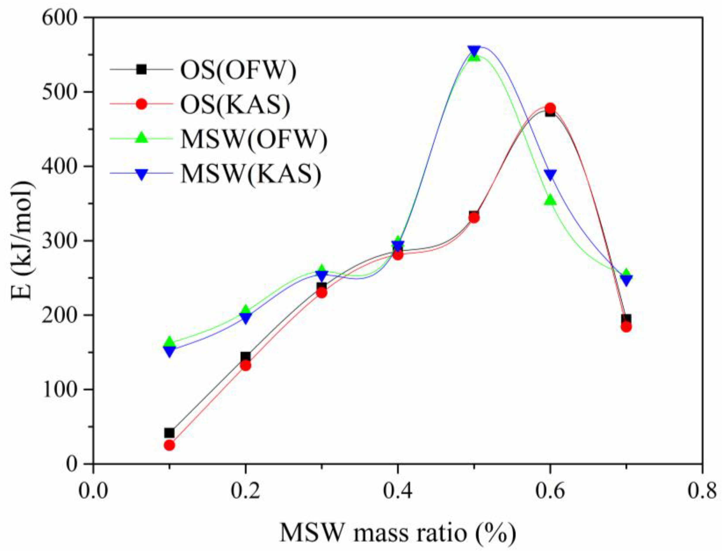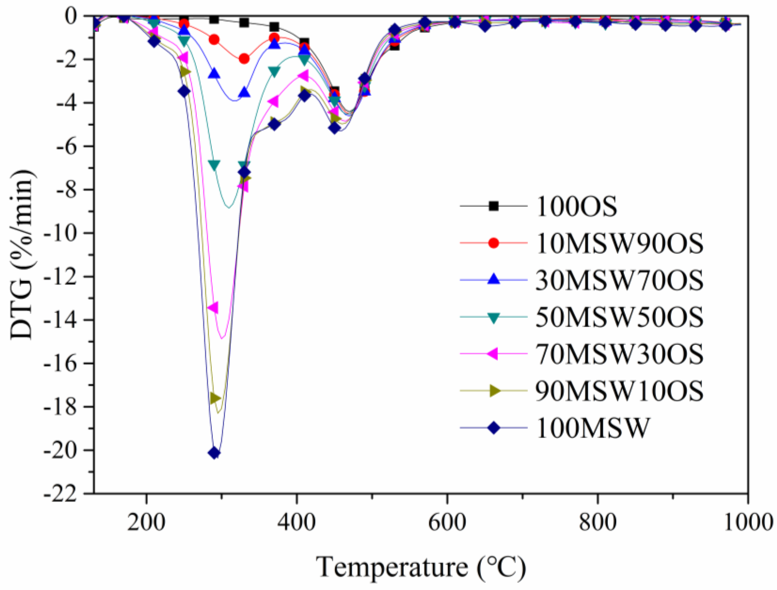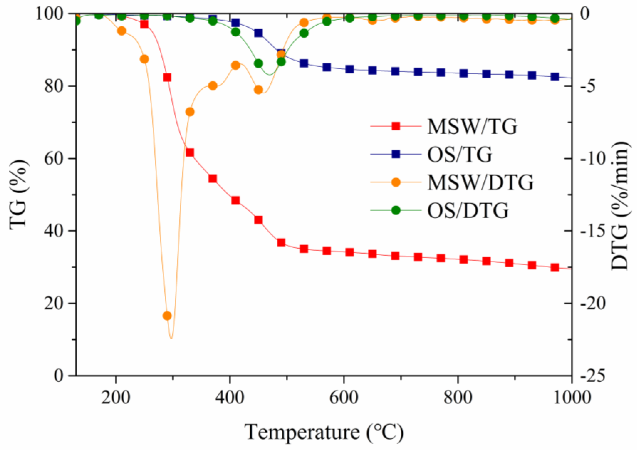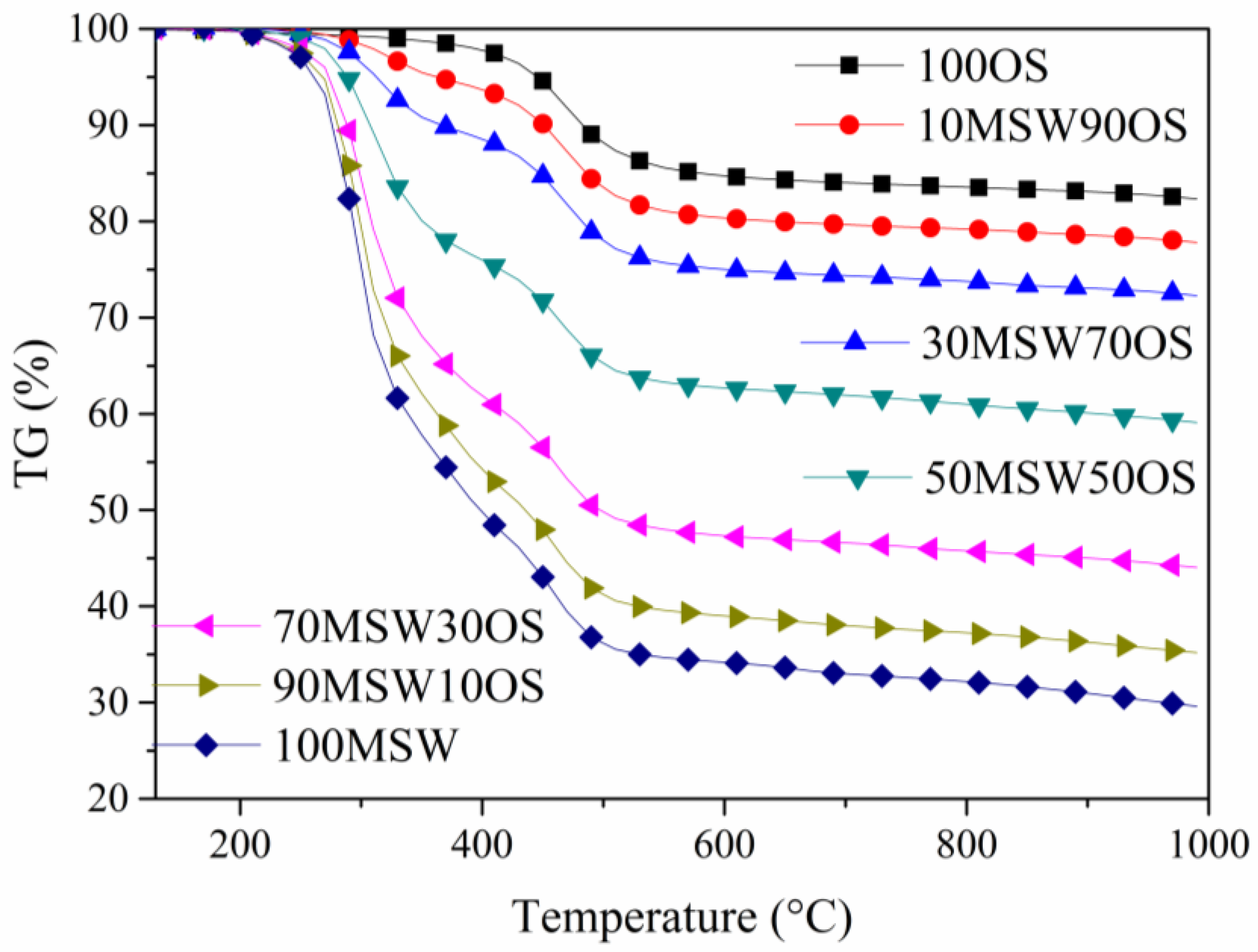 3.1. Thermogravimetric Analysis of Individual OS and MSW