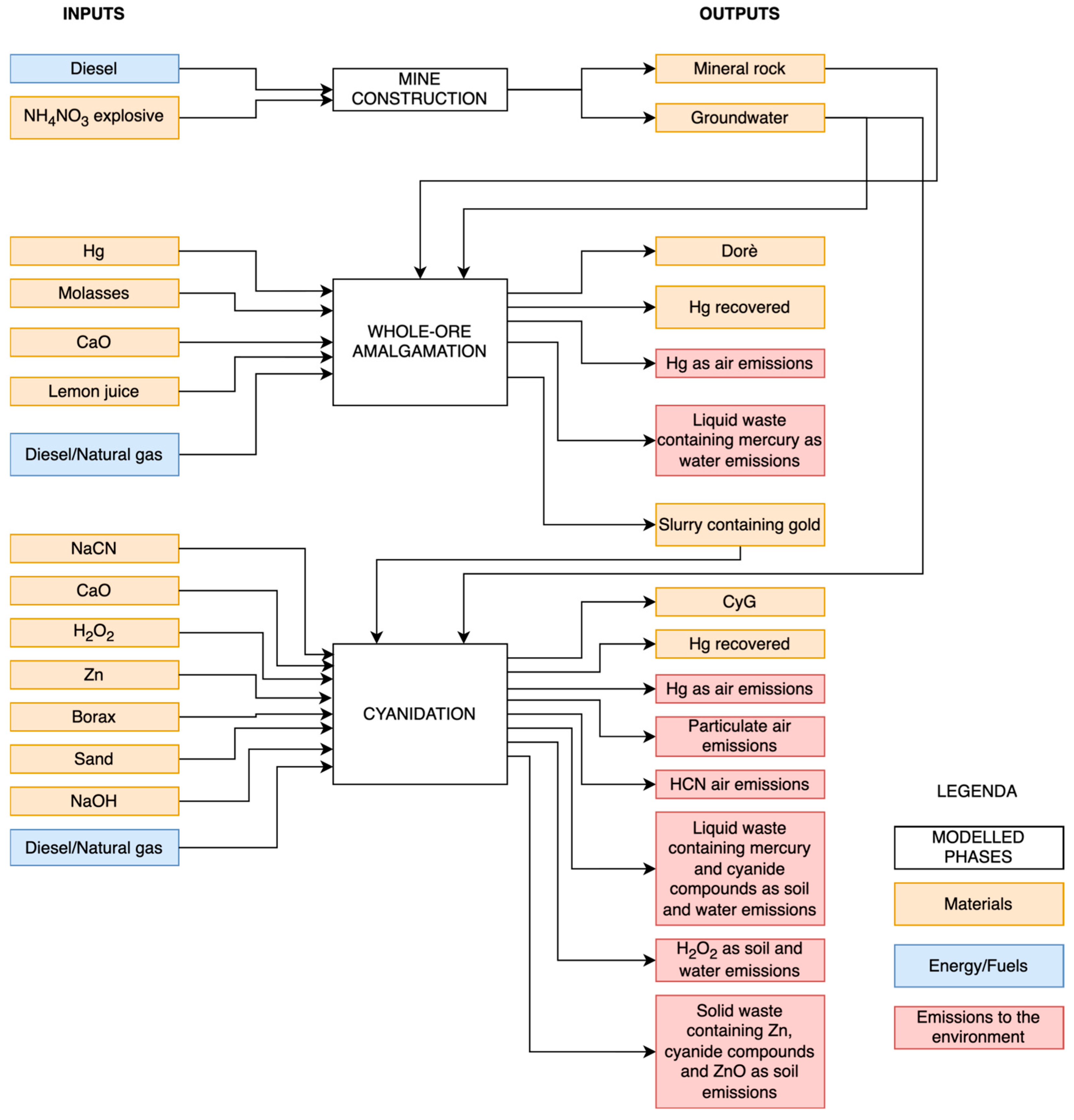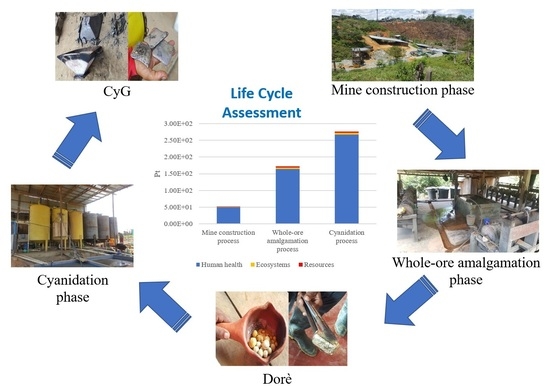 - Valdivia, S.M.; Ugaya, C.M.L. Life Cycle Inventories of Gold Artisanal and Small-Scale Mining Activities in Peru. J. Ind. Ecol. 2011, 15, 922–936. [Google Scholar] [CrossRef]