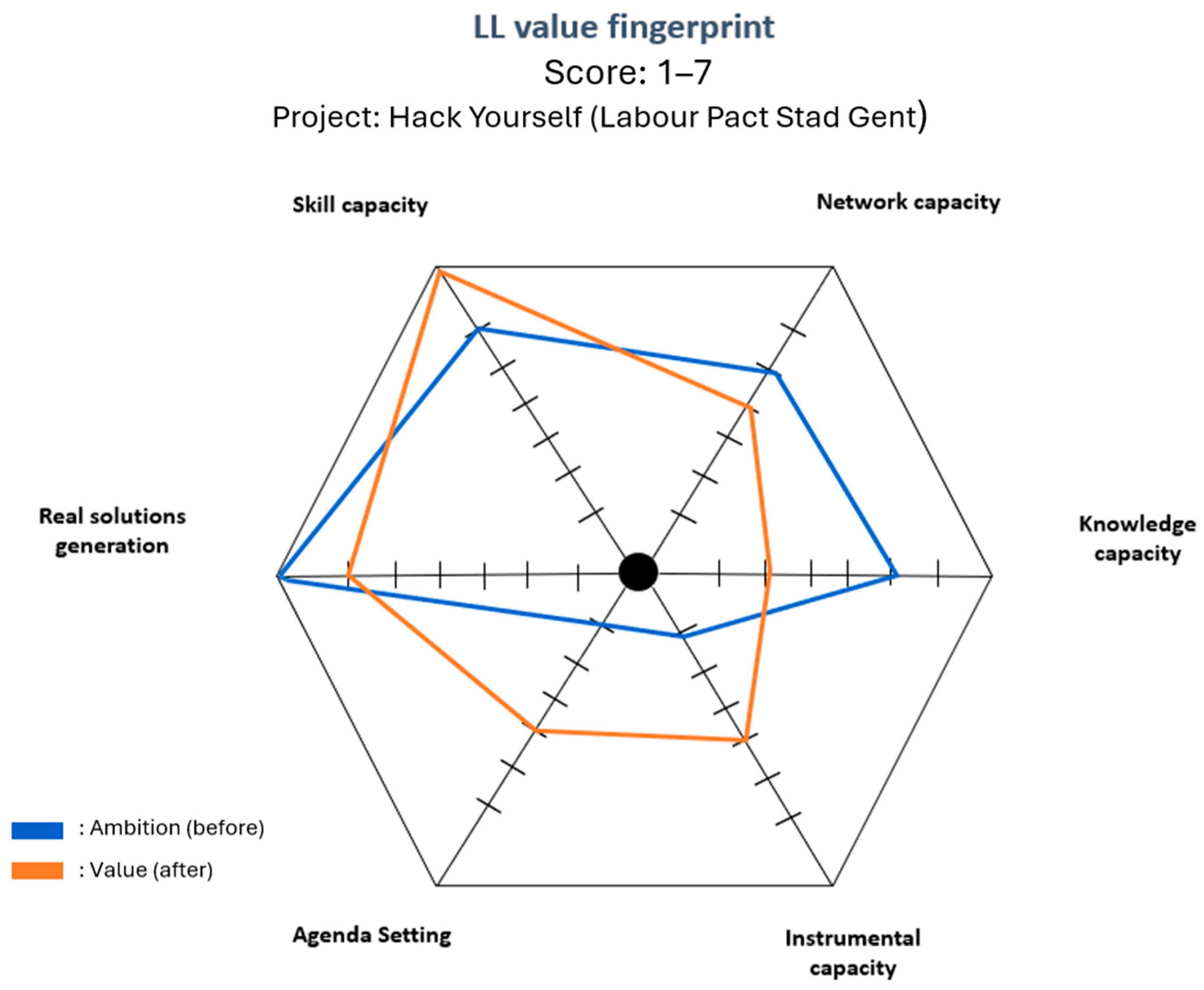 | Ghent Living Lab Community of Practice (2021–2022) | City of Ghent’s cross-project Community of Practice (CoP), connecting multiple Living Lab initiatives (urban, educational, and campus-based) for collective learning. | Living Lab practitioners from diverse Ghent-based projects (e.g., healthcare, cultural heritage, campus labs). 8 participants in the first workshop, 6 in the second, representing more than five distinct Living Lab projects. | Co-creation and validation of LLAM as a shared framework through two focus group workshops using a Theory of Change approach. Practitioners collaboratively defined inputs, activities, outputs, and outcomes for impact across projects and co-created common impact indicators. Developed practical tools: a step-by-step LLAM guide and the Living Lab Value Fingerprint visualization. | The framework was formally named the Living Lab Assessment Method (LLAM). Iterative use within the Community of Practice strengthened its robustness and usability. Peer co-validation improved conceptual clarity and contextual relevance. Impact concepts were aligned with practitioners’ experiential knowledge, refining value dimensions. The Living Lab Value Fingerprint and a step-by-step guide were developed to support practical application. Cross-project learning increased shared evaluative language and practitioner ownership. |