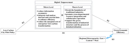 As a key enabling tool for driving low-carbon transition, digital technology’s interaction with the LCCP policy can significantly boost the policy’s positive impact on GEE. At the micro level, digital technology alleviates information asymmetry and reduces transaction costs, thereby accelerating green technology adoption and improving resource allocation efficiency. The traditional model suffers from information gaps that increase transition costs and dampen corporate responsiveness to policies. Digital technology, through enhanced data processing and analytical capabilities, efficiently integrates and interprets internal and external data streams. This capability significantly reduces search costs and replication costs [23], while also breaking spatiotemporal barriers to information dissemination [24]. By providing robust decision-support for energy management and technology selection, digital empowerment lowers the marginal cost of low-carbon transition and directly enhances production efficiency, constituting fundamental inputs to GEE measurement. At the macro level, digital platforms overcome information barriers to enable cross-sectoral resource integration and structural optimization. Legacy systems often fail to achieve efficient resource allocation due to information silos and fragmented markets. Digital platforms facilitate industrial symbiosis and smart outsourcing by connecting previously isolated sectors through enhanced information flow [24]. This system-level coordination promotes industrial restructuring [25] and drives economic structure toward lower-carbon, higher-value activities. The development of digital infrastructure further reinforces this transition by systematically improving regional total factor productivity [26,27], thereby enhancing the structural dimension of GEE. Thus, the following hypothesis is advanced:
