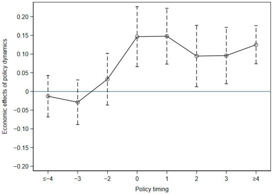 From Figure 3, it reveals an adverse economic impact of approximately −0.10 during the initial policy rollout phase. This adverse effect moderates in subsequent periods, diminishing to around −0.05 in period 2 and converging towards neutrality (0) by period 3. Crucially, the analysis demonstrates that the positive economic dividends of the policy are realized only over the longer term, with the effect becoming positive and strengthening to around 0.05 or higher when the policy is sustained for four or more periods. Overall analysis shows no discernible influence on economic outcomes before implementation. However, a significantly positive economic effect emerged after implementation, which later diminished and eventually stabilized.