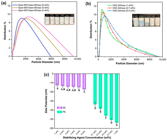 (a) Particle size distribution of Span-80/Tween-80 emulsions (SE) at stabilizer concentrations of 4, 5, and 6 wt%. (b) Particle size distribution of CNC-SA/wax emulsions (PE) at stabilizer concentrations of 0.5, 0.7, and 1 wt%. (c) Zeta potential of the SE and PE as a function of increasing stabilizer concentrations. Note that images of the suspensions are presented at all concentrations tested, but only select particle size distributions are included for clarity. Different letters (A–G) indicate significant statistical differences by Tukey’s test (p < 0.05).