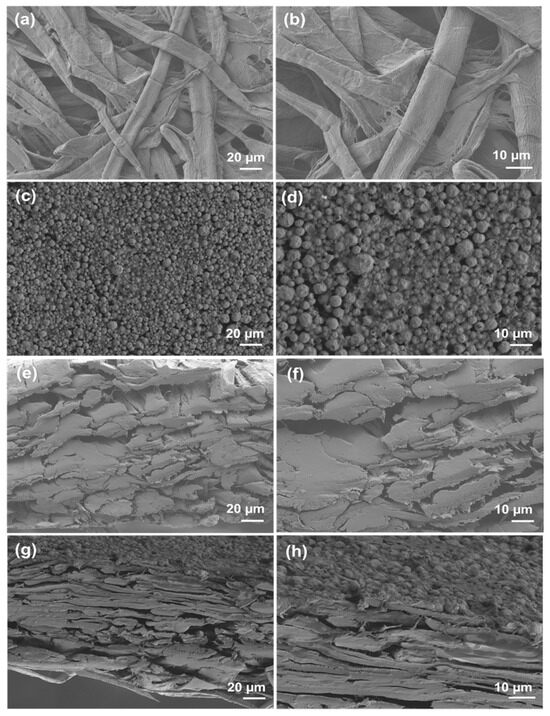 SEM micrographs of the surface and cross-section of uncoated and Span-80/Tween-80 /wax (6 wt%) emulsion (SE) coated NBK paper: (a,b) uncoated surface; (c,d) coated surface; (e,f) uncoated cross-section; (g,h) coated cross-section.