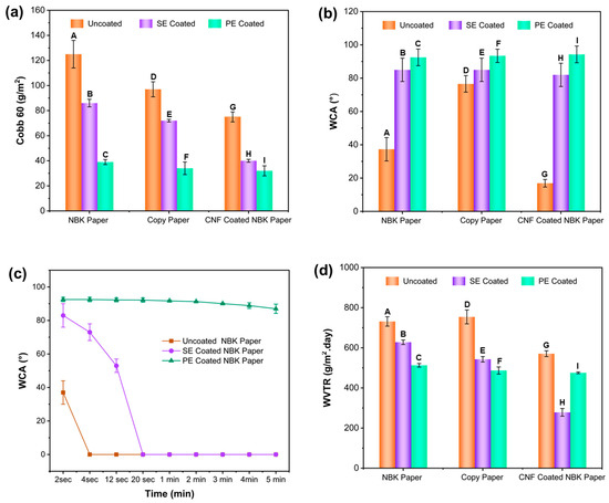Comparison of water and water vapor barrier performance for uncoated, SE-coated, and PE-coated NBK, copy, and CNF-coated NBK papers: (a) Cobb 60 liquid water absorptiveness, (b) WCA, (c) Temporal evolution of the WCA, and (d) WVTR. All coated samples had an emulsion coat weight of 5 g/m2. Uncoated and coated samples within each paper type were compared using pairwise statistical analysis. Different letters (A–I) indicate significant statistical differences by Tukey’s test (p < 0.05).