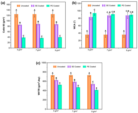 Water barrier properties and water vapor transmission rate of SE-coated and PE-coated NBK paper as a function of increasing coat weight.: (a) Cobb 60 liquid water absorptiveness, (b) WCA, and (c) WVTR. Different letters (A–E) indicate significant statistical differences by Tukey’s test (p < 0.05).