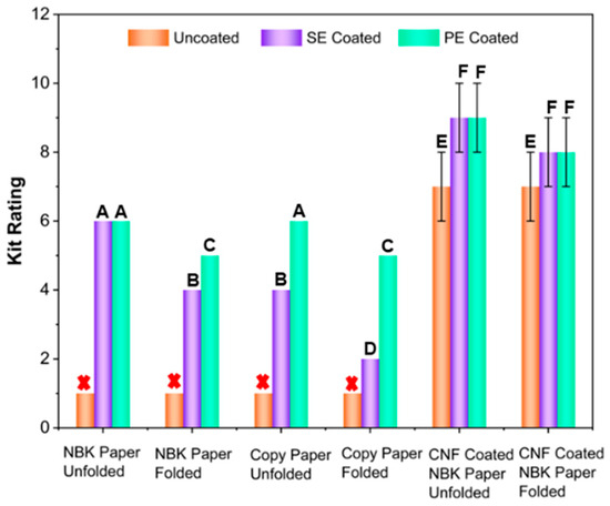 Kit ratings of uncoated, SE-coated, and PE-coated NBK, copy, and CNF-coated NBK papers under unfolded and folded conditions. Five measurements were performed for each condition, and all standard deviations were zero except for the CNF-coated NBK paper. Different letters (A–F) indicate significant statistical differences by Tukey’s test (p < 0.05), and the cross symbol indicates no oil resistance (kit rating = 0).