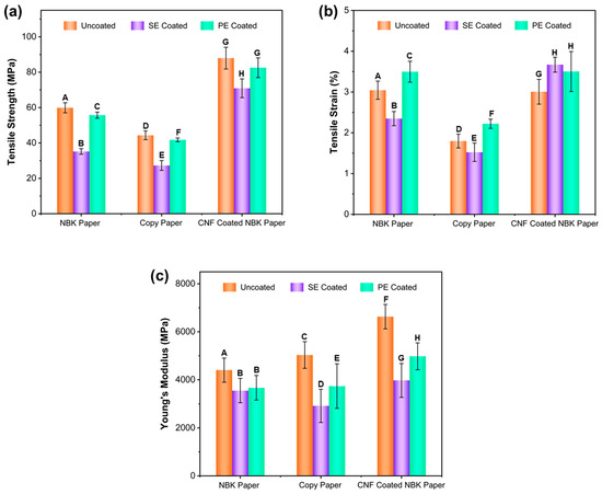 Mechanical properties of uncoated, SE-coated, and PE-coated NBK, copy, and CNF-coated NBK paper: (a) Tensile strength, (b) Tensilestrain, and (c) Young’s modulus. Note: Uncoated and coated samples within each paper type were compared through pairwise statistical analysis. Different letters (A–H) indicate significant statistical differences by Tukey’s test (p < 0.05).