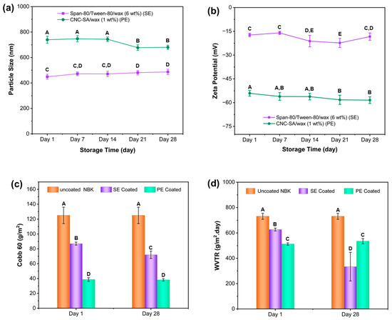 Storage stability and functionality of SE and PE: (a) Mean particle size, (b) mean zeta-potential measurements, (c) Cobb 60, and (d) WVTR as a function of time. Different letters (A–E) indicate significant statistical differences by Tukey’s test (p < 0.05).