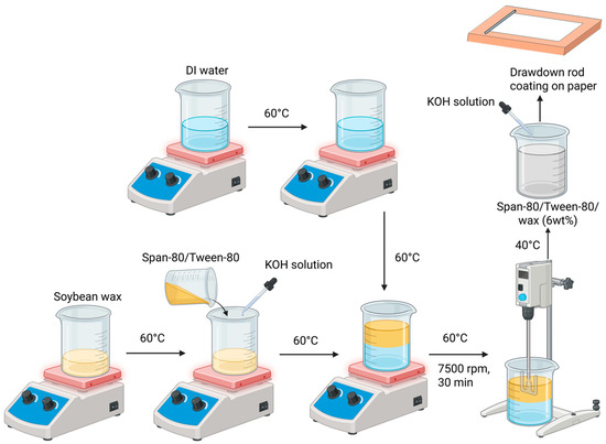 To create a stabilized SE, the ratio of Span-80/Tween-80 was determined by adjusting the hydrophilic–lipophilic balance (HLB) to 10 using the known HLB of 4.3 for Span-80 and of 15 for Tween-80, i.e., Span-80 at 46.7 wt% and Tween-80 at 53.3 wt%, following Li et al. [57]. Six SEs were prepared with a soy wax concentration of 20 wt% but varying concentrations of the Span-80/Tween-80 mixture at 1, 2, 3, 4, 5, and 6 wt%, respectively. The process of preparing one SE with 6 wt% of the surfactant mixture is illustrated in Scheme 1. Pure soy wax flakes were heated to their molten state in a glass beaker placed on a hotplate at a temperature above 60 °C. The calculated mass of the Span-80/Tween-80 mixture, equivalent to 6 wt% of the total mass of the SE, was added to the molten wax. A trace amount of KOH solution with a concentration of 15 wt% was added to the molten wax to neutralize the free fatty acids, such as oleic (approximately 0.027 wt%) present in the soybean wax. In addition, a sufficient amount of deionized (DI) water (16.5 MΩ·cm) was heated to 60 °C and then added to the molten wax. For example, to prepare 400 g of SE containing 6 wt% of the Span-80/Tween-80 stabilizer mixture, 11.2 g of Span-80 and 12.8 g of Tween-80 were first added to 80 g of molten wax, followed by the addition of 296 g of preheated water to the mixture. The mixture was immediately emulsified using a high shear laboratory mixer (Silverson L5M-A, Silverson Machines Ltd., Chesham, UK) at 7500 rpm for 35 min. The temperature of the mixture was maintained at 60 °C throughout the high-shear mixing. The mixture was then cooled to below 40 °C using a water bath at room temperature while stirring at 650 rpm with a magnetic stirrer. Finally, the pH of the SE was adjusted to 7.0 by gradually adding a 15 wt% KOH solution dropwise.