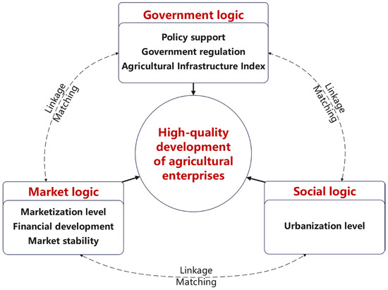 Accordingly, this study employs dynamic QCA to construct a spatio-temporal analytical framework that includes seven antecedent conditions: policy support, government regulation, Agricultural Infrastructure Index, marketization level, financial development level, market stability, and urbanization level. The aim is to explore how these interlinked conditions jointly drive multiple pathways toward the high-quality development of agricultural enterprises. The theoretical analytical framework is illustrated in Figure 1.