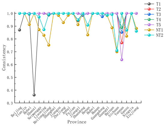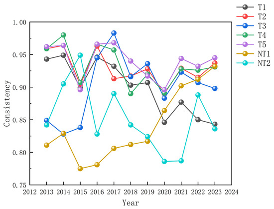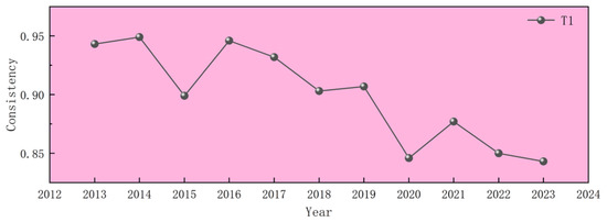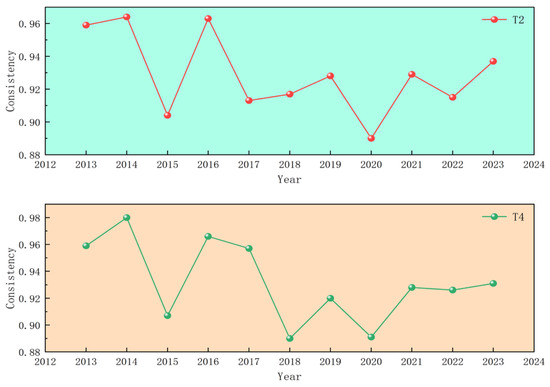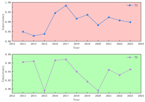 As it shown in Figure 3, A key temporal feature is the gradual weakening of T1. Its consistency declines from 0.949 (2014) to 0.843 (2023). This suggests that a finance–marketization pathway accompanied by low regulatory intensity becomes less uniformly sufficient over time, potentially because agricultural upgrading increasingly requires more coordinated governance, standardization, and broader ecosystem support as markets deepen and competition intensifies. In other words, as the institutional environment evolves, “market–finance dominance” alone may no longer match the full set of requirements for sustained productivity improvement in all contexts.