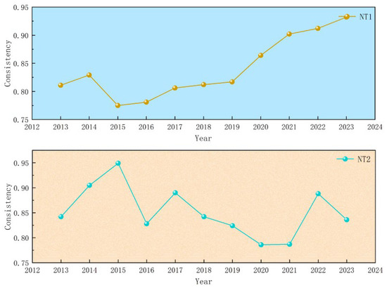 Dynamic QCA allows us to examine the temporal fit of each configurational pathway across the 2013–2023 period. The between-group adjusted distances reported in Table 4 are all well below 0.2, indicating that the identified paths are broadly stable across time. Figure 2 further presents year-by-year between-group consistency, showing that while the structural form of configurations remains stable, their empirical consistency varies—reflecting changes in the alignment between institutional combinations and high-quality outcomes over time. These temporal patterns should be interpreted as evolving configurational sufficiency rather than strict time-lag causation.