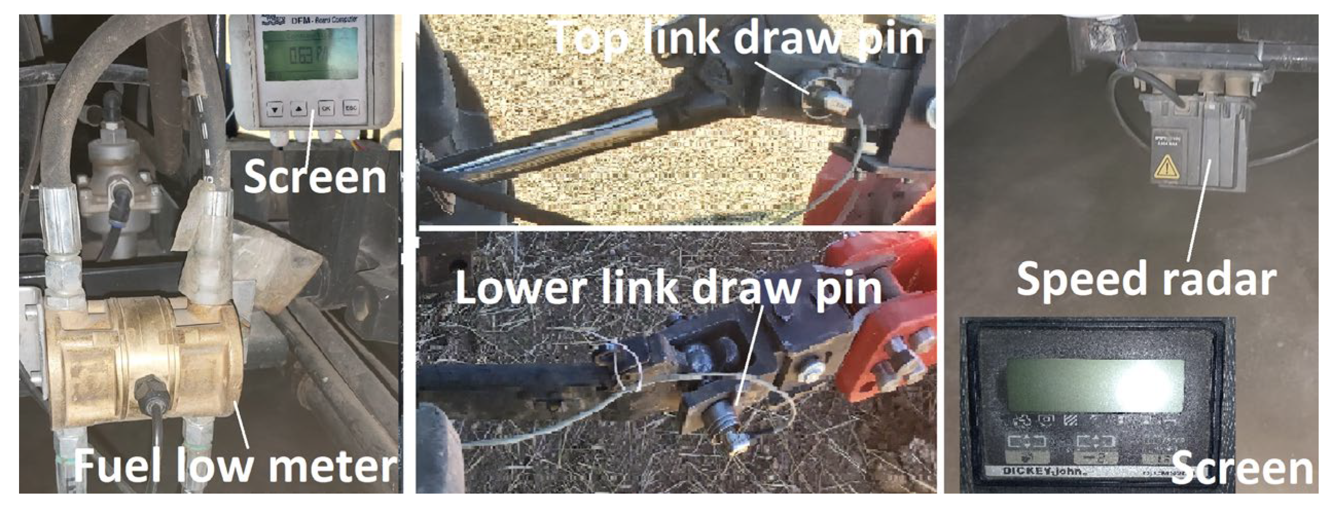 −1. During the experiments, one sensor was installed between the fuel filter and the injection pump, while the second sensor was positioned along the return line to measure surplus fuel flowing back to the fuel tank from the injectors and injection pump. The draft force requirement of the implement was measured by mounting 30 kN capacity load cells on the tractor’s three-point hitch linkage. Data acquisition was performed using a data logger with a sampling frequency of 20 Hz. The tractor’s true forward speed was determined using a Dickey-John (version DJCMS200) system (
