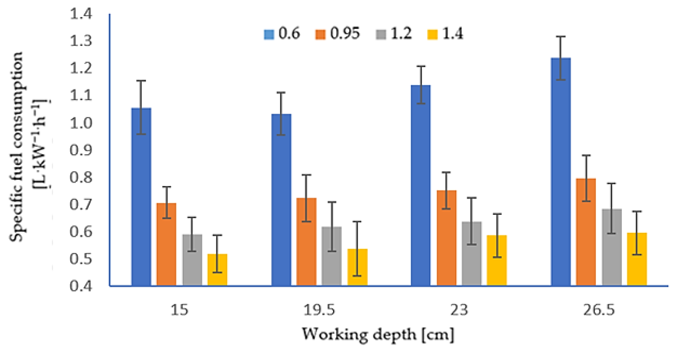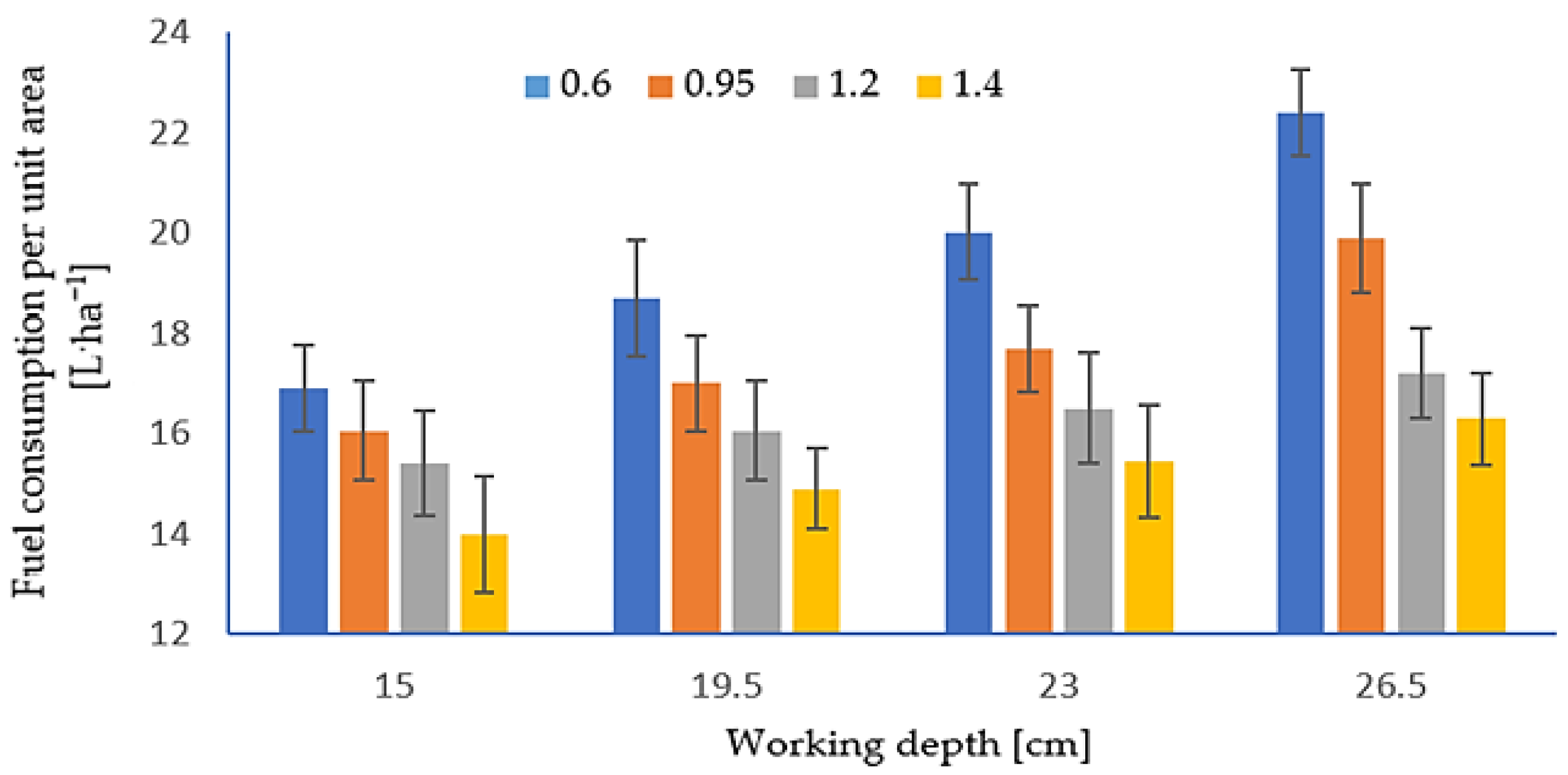 29]. An increase in tractor operating speed during plowing resulted in higher fuel consumption. Moreover, increasing tillage depth had a greater impact on fuel use than changes in forward speed. Additionally, the combined influence of operating speed and tillage depth led to a further rise in fuel consumption [