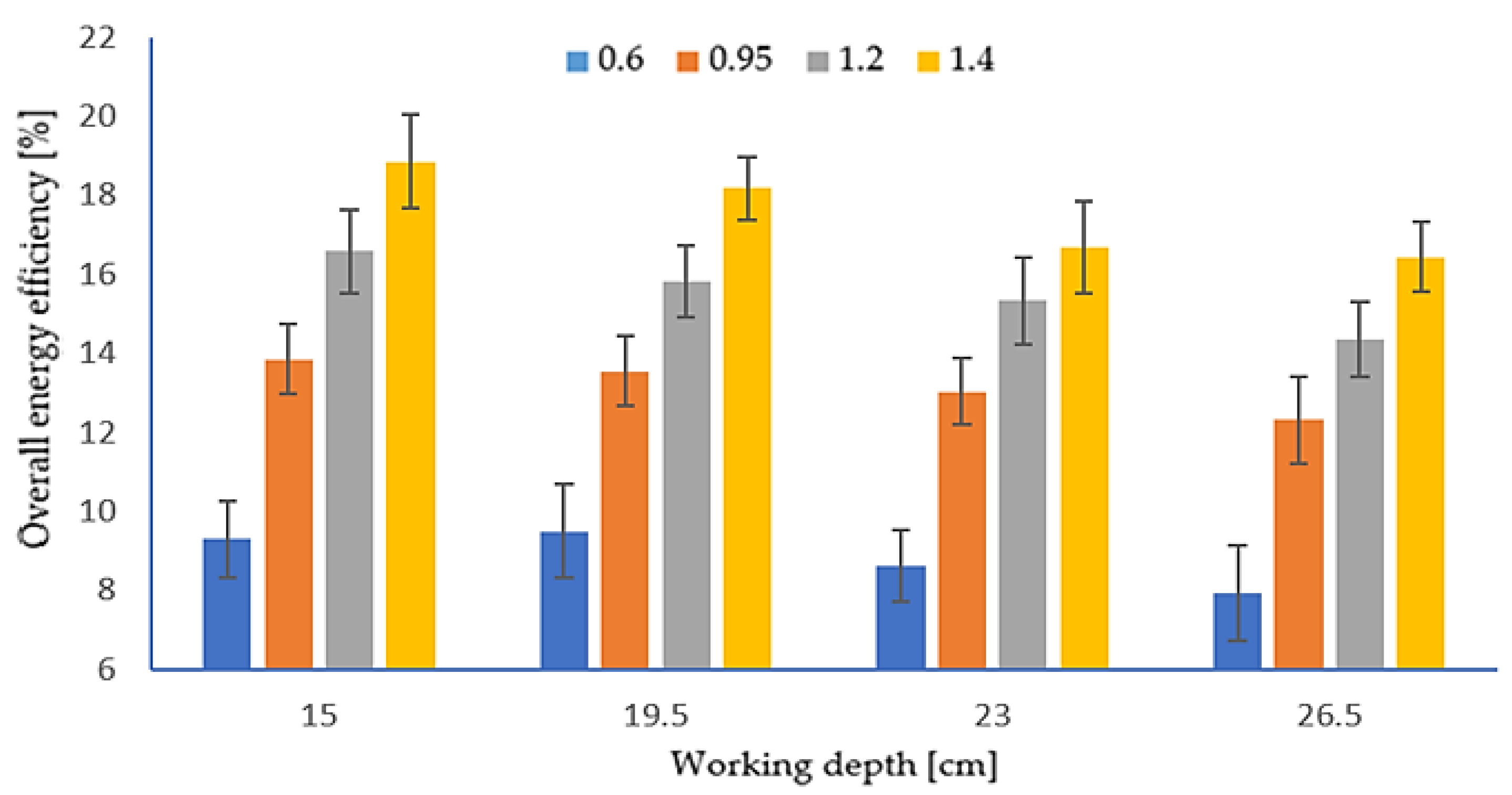 31] found that forward speed and working depth had an impact on overall energy efficiency. They achieved a maximum overall energy efficiency of 73.08% at a forward speed of 3.5 km·h