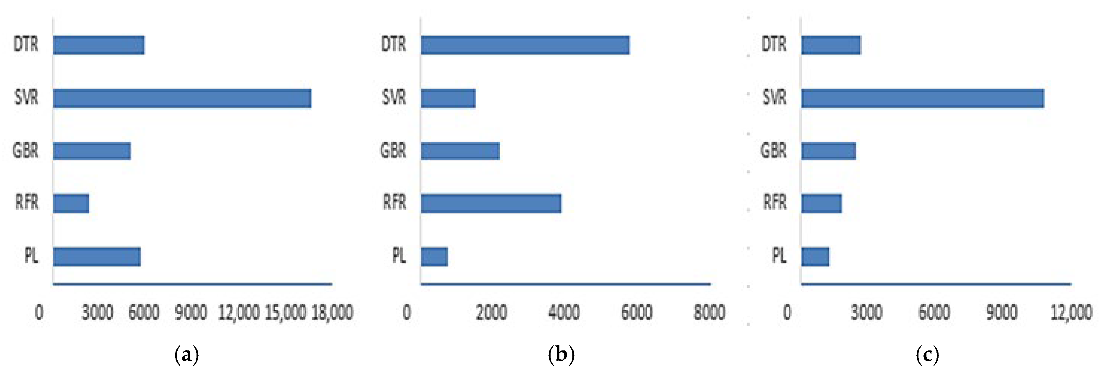 Figure 6c). Overall, the PL model exhibited the best performance in predicting fuel consumption per unit area and overall energy efficiency, whereas the RFR model was more effective in estimating specific fuel consumption, for which relatively higher error rates were observed across the remaining models.