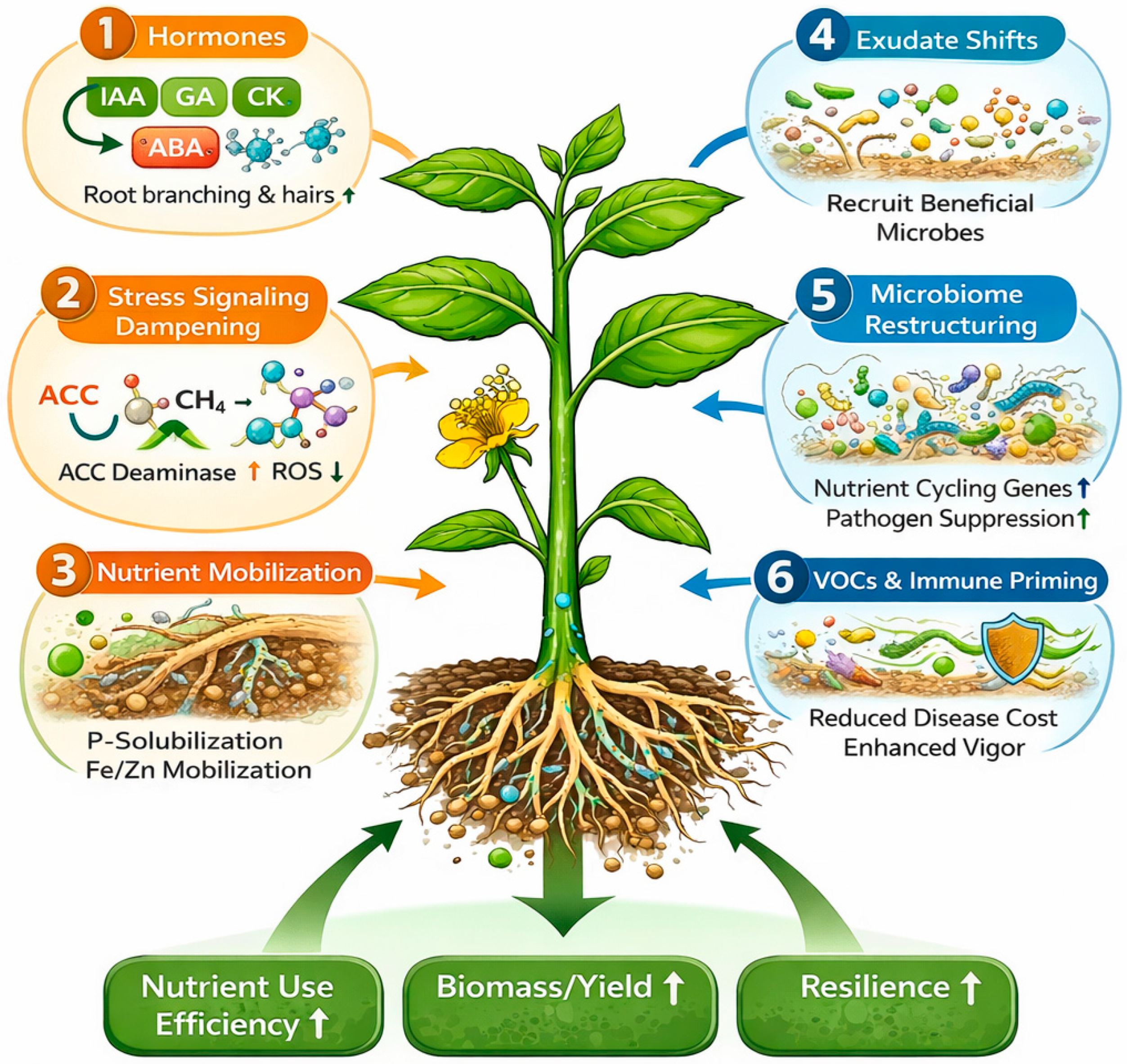 5.5. Bioactive Metabolites, VOCs and Immune Priming That Support Growth