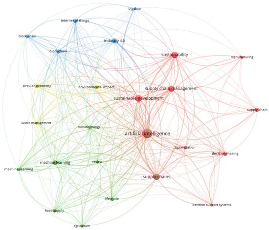 Using VOSviewer, we identified 1735 keywords that appeared at least five times. The most frequent keywords were artificial intelligence (97 occurrences), sustainable development (50), sustainability (44), supply chain management (41), and supply chain (40). The keyword network analysis included 25 terms that met this criterion. In the network, each node corresponds to a keyword, and its size indicates the frequency of occurrence. The links between nodes indicate the co-occurrence of keywords within individual publications.