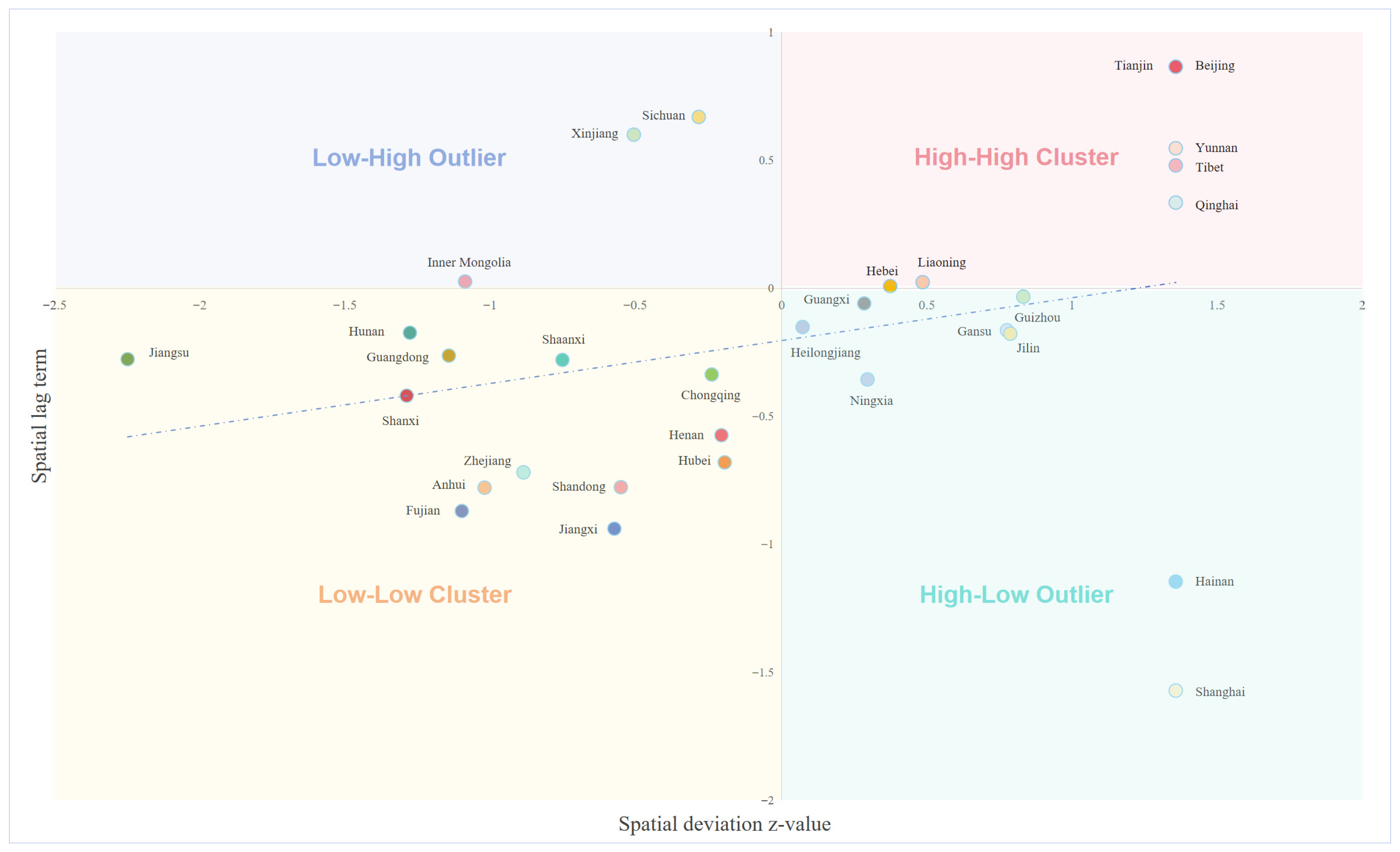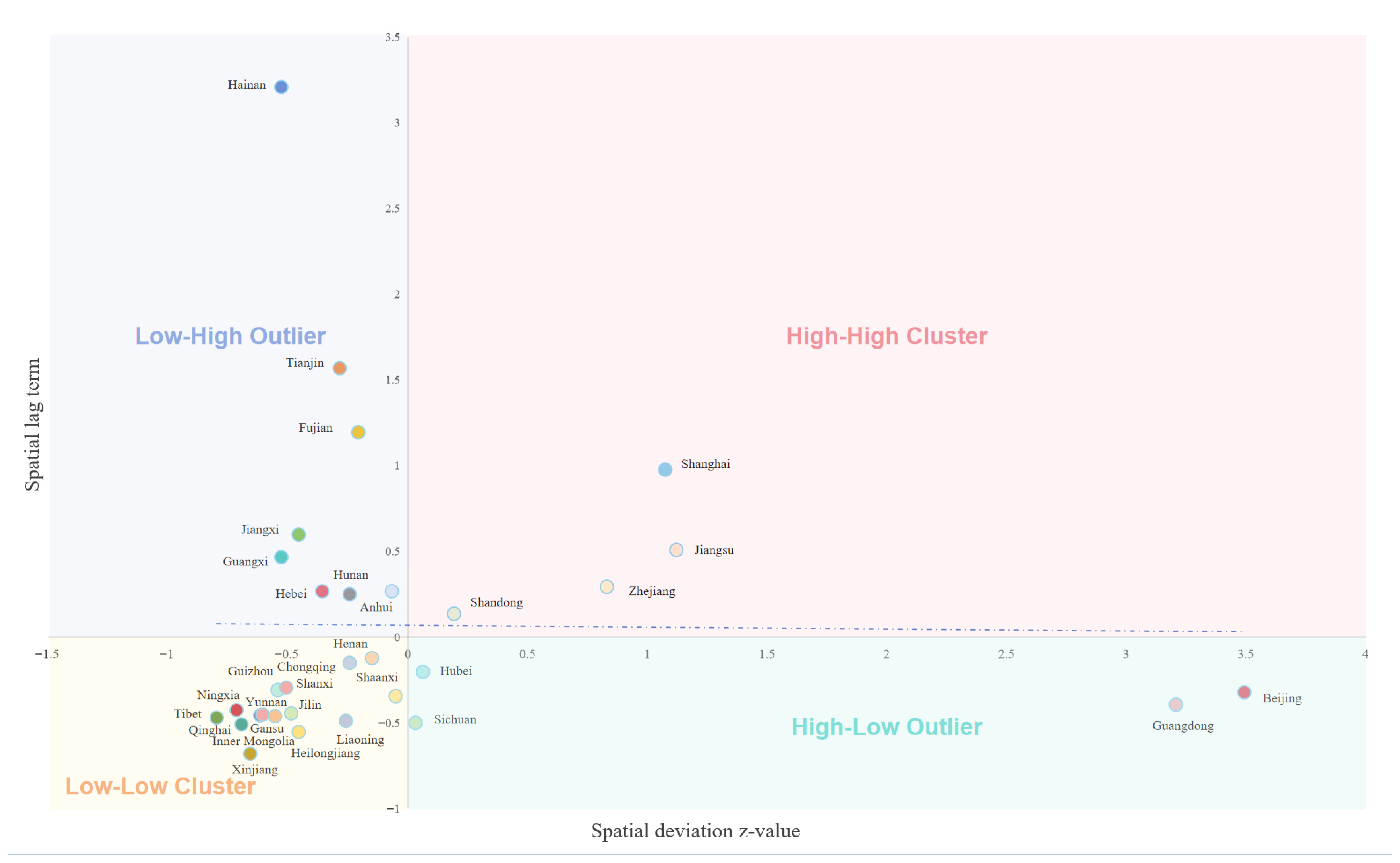 | Hainan | −1.642 | −0.033 | 0.602 | −2.601 | 0.002 |