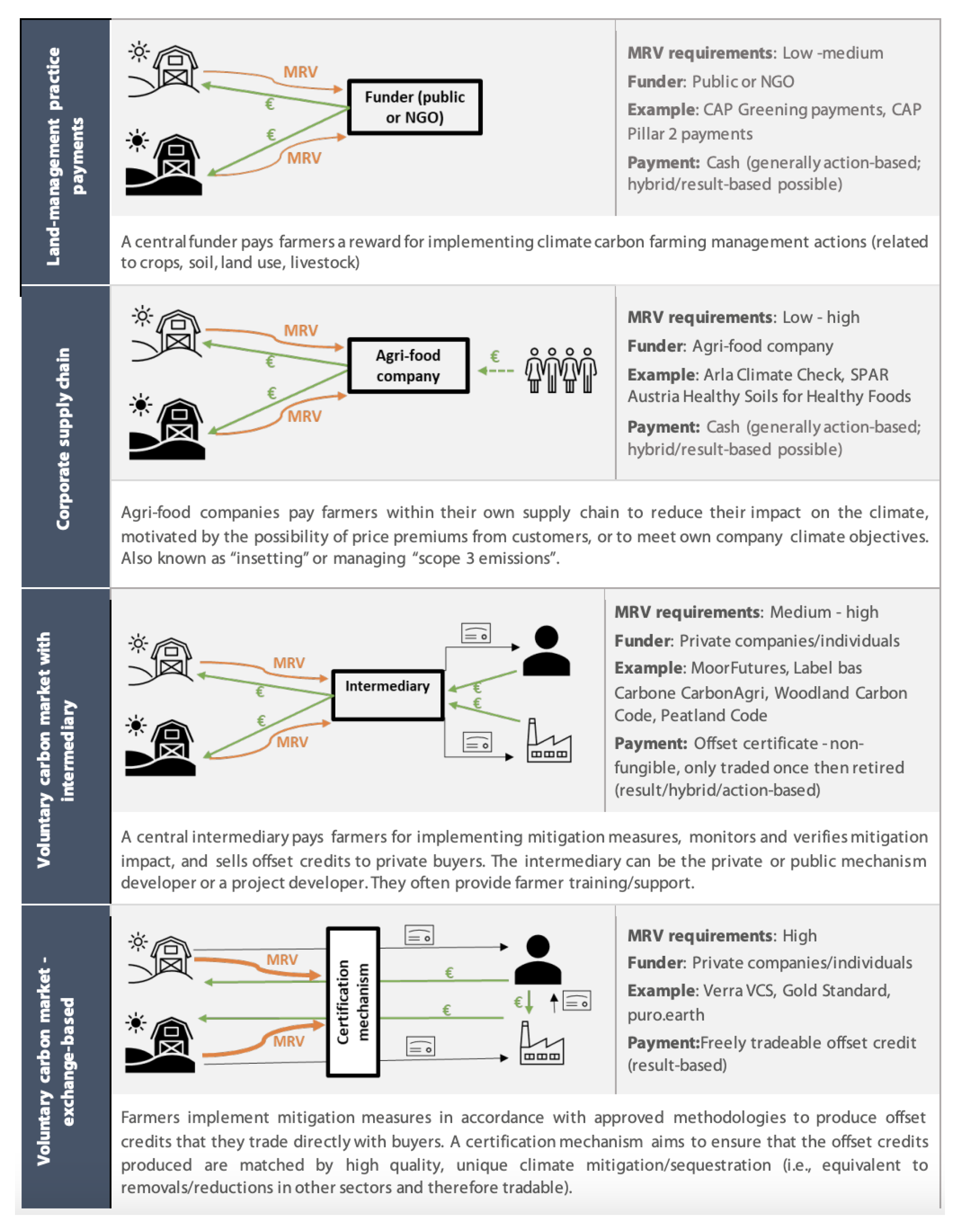 - Voluntary Carbon Markets: Voluntary carbon markets allow farmers to implement specific carbon reduction or sequestration projects that generate tradable carbon credits. These markets have the potential to mobilize private sector investment in carbon farming, although participation is often limited by price volatility, high verification costs, and access barriers for small-scale farmers [37,38]. Voluntary carbon markets generally operate through two main structures: (i) intermediary-based models, where brokers or institutions connect farmers with buyers, and (ii) direct exchange-based systems, where farmers trade verified carbon credits directly with purchasers. Intermediary mechanisms may help reduce economic uncertainty by facilitating credit transactions, but can also increase management costs and limit transparency in project-level financial flows [39]. Direct exchange models, such as those certified by Verra VCS, Gold Standard, or puro.earth, typically require more rigorous MRV systems, yet provide greater traceability and potentially more flexible trading opportunities.