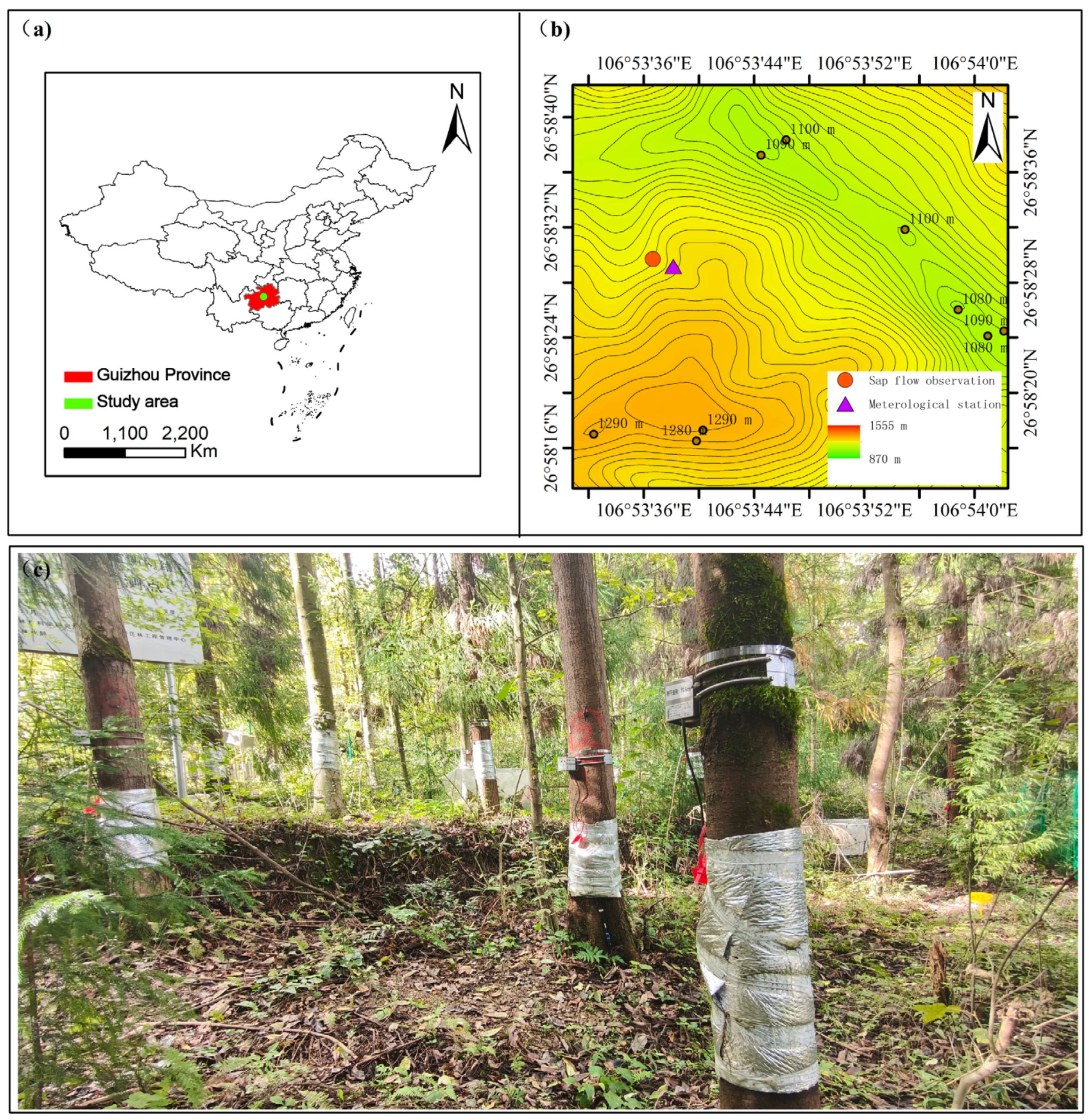 - Li, C.; Liu, Y.; Ding, F.; Shu, D.; Cui, Y.; Zhao, W.; Hou, Y.; Wu, P. Transpiration characteristics and influencing factors of the dominant species of Machilus microcarpa in Maolan Karst forest. J. Nanjing For. Univ. 2019, 43, 51–58. [Google Scholar]