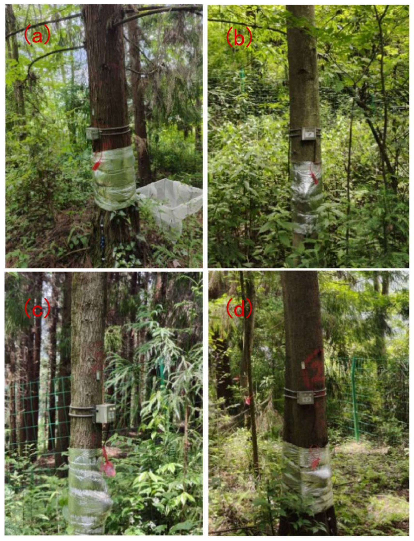 - Tang, J.; Ding, Z.; Wang, G.; Wang, Y. Sap flow dynamics of co-occurring trees in response to seasonal droughts in a subtropical climate. Front. Ecol. Evol. 2025, 13, 1550290. [Google Scholar] [CrossRef]