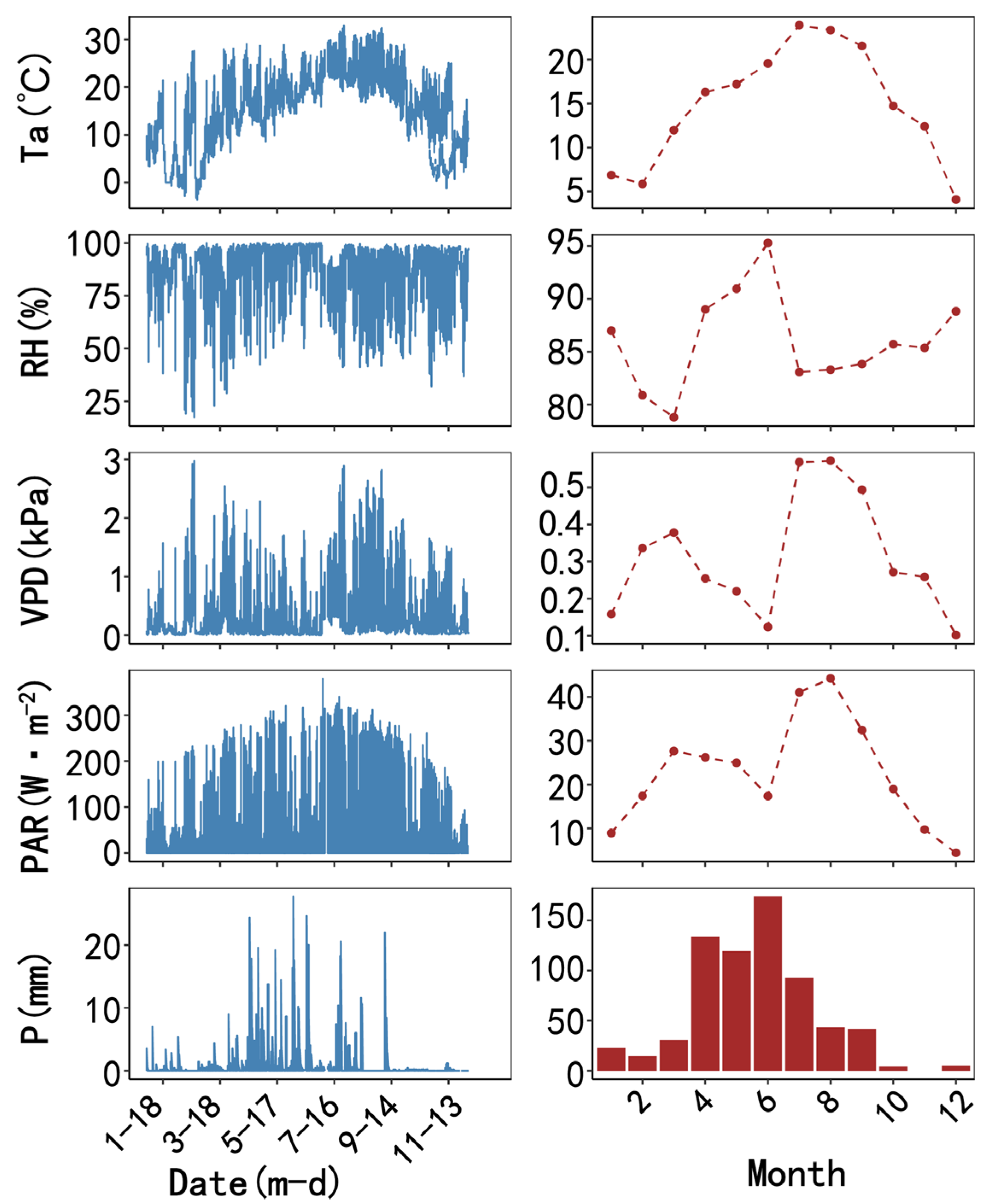 - Han, S.; Wang, Q.; Zhao, Y.; Zhai, J.; Wang, X.; Hao, Y.; Li, L.; Li, X.; Li, H.; Cao, J. Response of typical tree species sap flow to environmental factors in the hilly areas of Haihe River Basin, China. Forests 2024, 15, 294. [Google Scholar] [CrossRef]