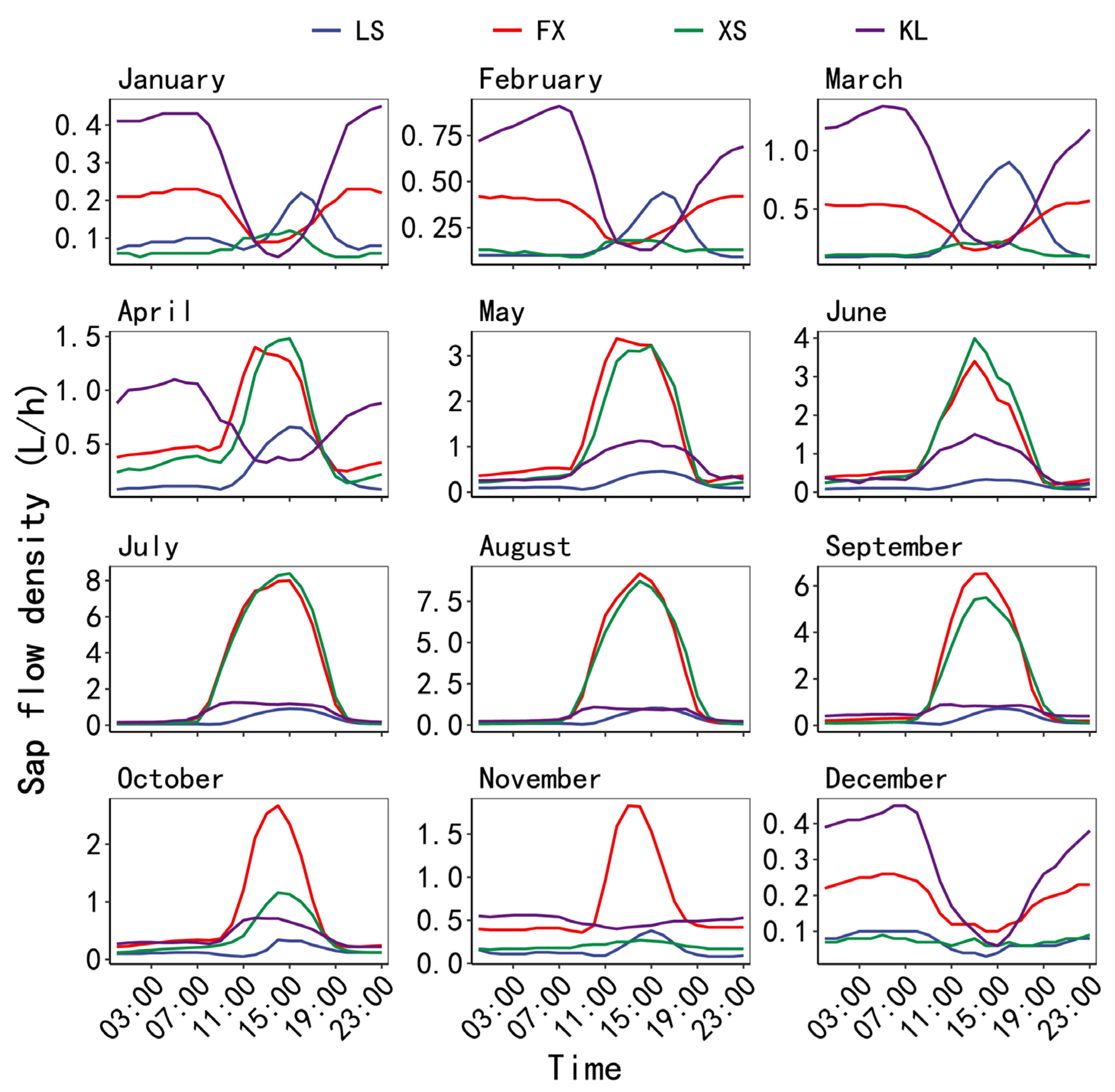 3.2. Dynamic Variation in Sap Flow